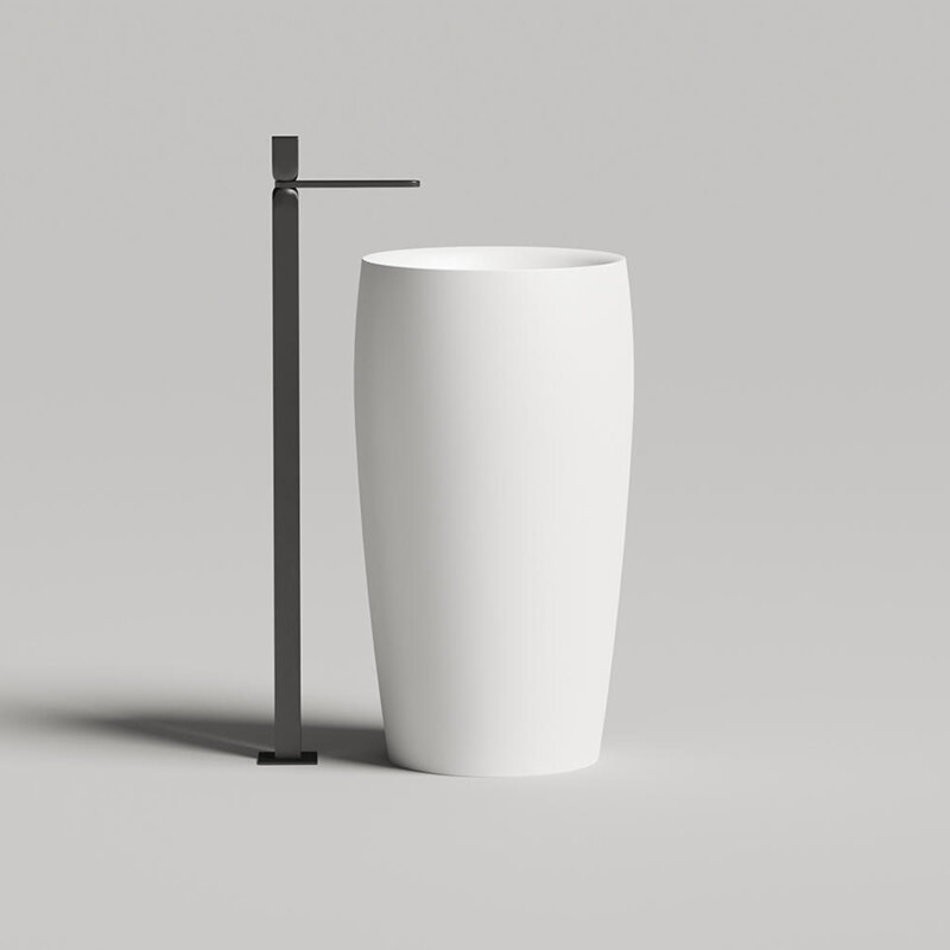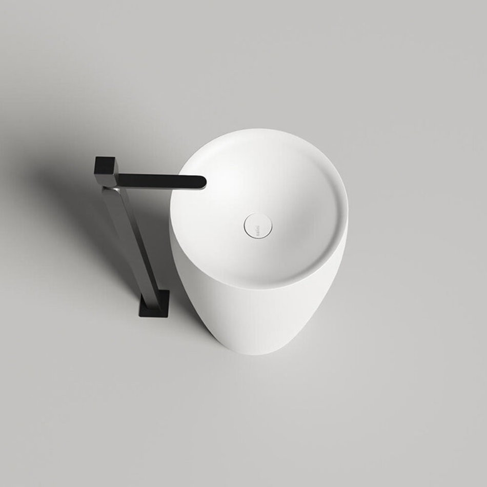 ALDA 03 — напольная раковина, которая может быть установлена со сливом как в пол, так и в стене. Конструкционная возможность предусматривает вариант выреза сзади изделия, что позволит подключать данную раковину во многих пространствах.