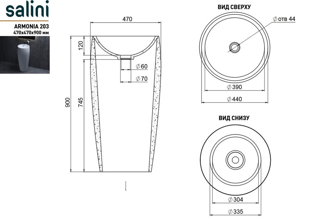 Раковина Salini Armonia 203, 47 x 47 х 90 см, из искусственного камня, белый глянцевый, 130113G