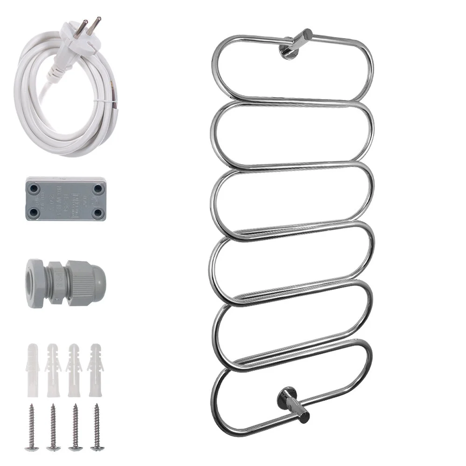 Комплектация: полотенцесушитель на кронштейнах — 1 шт.; электрический шнур (150 см) с вилкой — 1 шт.; муфта переходная для подключения электрического шнура — 1 шт.; уплотнительные прокладки — комплект; шурупы с дюбелями — комплект; инструкция — 1 шт.