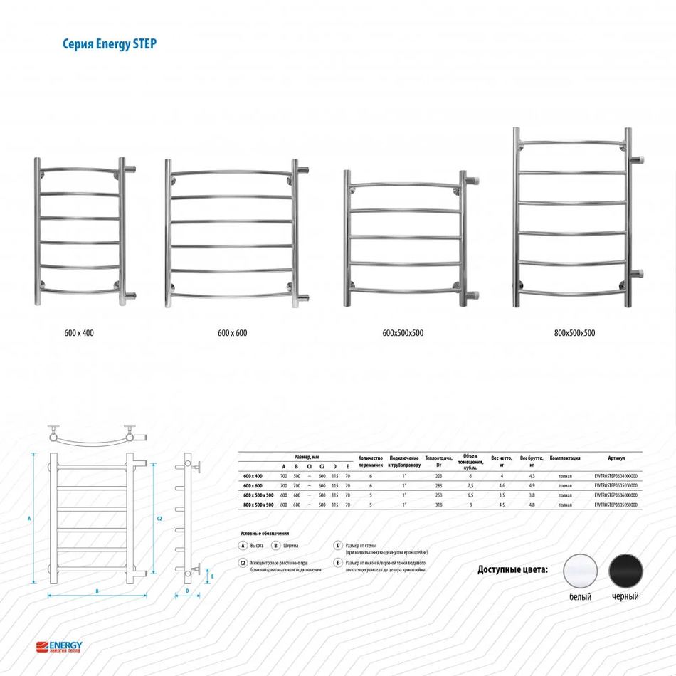 Полотенцесушитель водяной Energy Step 600 x 500, ширина 50 см, высота 60 см, боковое подключение 1 дюйм, черный матовый, EWTR0STEP06050R905M
