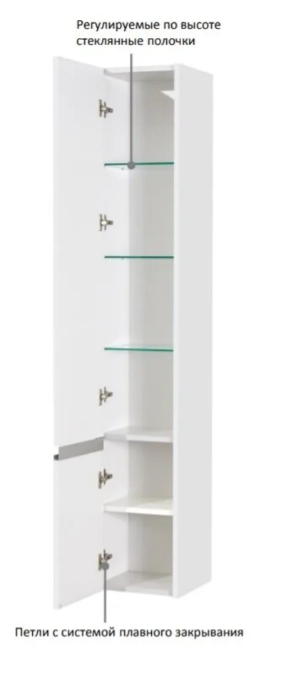 Пенал Монтаж: подвесной Размер: 30 x 26.5 x 163 см Полка вкладная Полки стеклянные: 3 Навес: 2 Фасады: 2 С системой плавного закрывания Покрытие: ламинат Материал: МДФ Форма: прямоугольная Цвет: белый глянцевый
