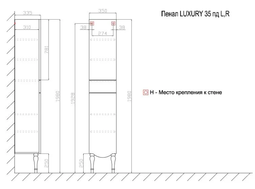 Пенал Размер: 35 x 34 x 198 см Монтаж: напольный Двери распашные: 2 Ящики выдвижные: 1 Система плавного закрывания Ориентация: левая/правая Материал: ЛДСП Форма: прямоугольная Цвет: белый