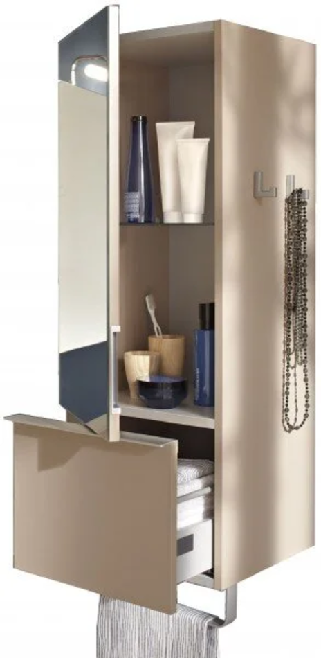 Оснащение: 2 крючка для украшений, 1 полотенцедержатель, выдвижной ящик с механизмом "плавное закрывание", петли с доводчиками.