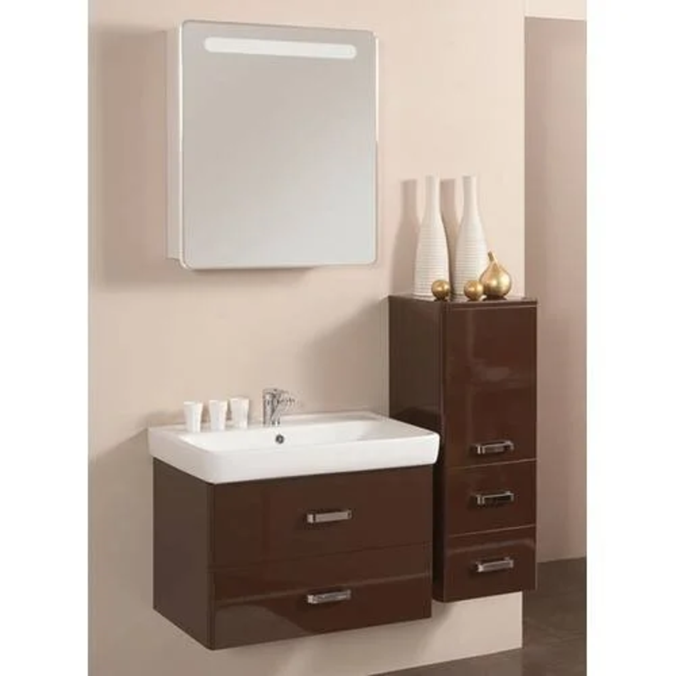 Стильная лаконичная модель, укомплектованная прямоугольной керамической раковиной с широкой удобной чашей. В тумбе установлены два ящика, изготовленные из декоративной влагостойкой ДСП. Нижний ящик тумбы – широкий и вместительный – предназначен для крупных предметов, а в верхнем имеется специальная организация пространства, позволяющая хранить мелкие вещи.