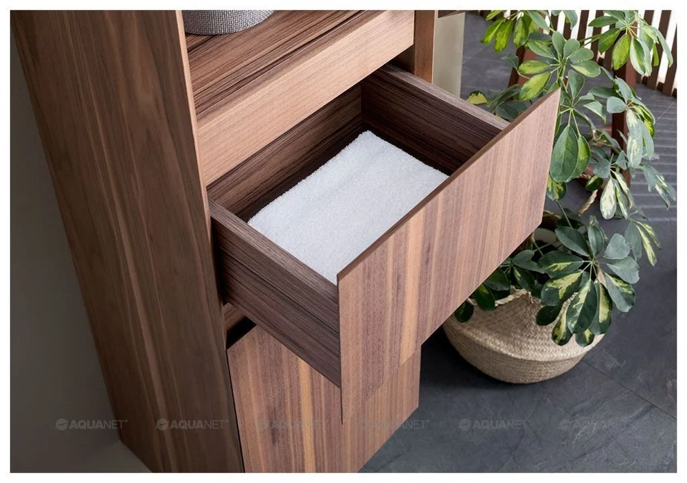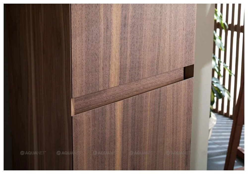 Шкаф-пенал для ванной Aquanet Нью-Йорк 35 (орех) не нуждается в дополнительных декоративных деталях, живописной фурнитуре – шпон ореха, используемый в качестве покрытия, выполняет функции декорирования наилучшим образом. А для открывания дверок пенала и выдвижения ящичка торцевые детали фасадов снабжены специальными скосами, что превращает их в удобный элемент открывания. Это и есть так популярные сейчас интегрированные ручки. Корпус традиционно для мебели Aquanet выполнен из влагостойкой ЛДСП, фасады – из МДФ. Пенал имеет универсальный способ установки, то есть его можно подвесить, а можно и установить на ножки. Он предоставляет дополнительные места хранения к базовому комплекту мебели, в который входит только тумба и зеркальный шкафчик. Зона хранения пенала шириной 35 см и высотой 162,5 см распределена по пяти полочкам, скрытым за двумя распашными дверцами и ящичком, расположенным между ними.