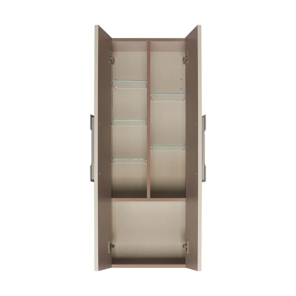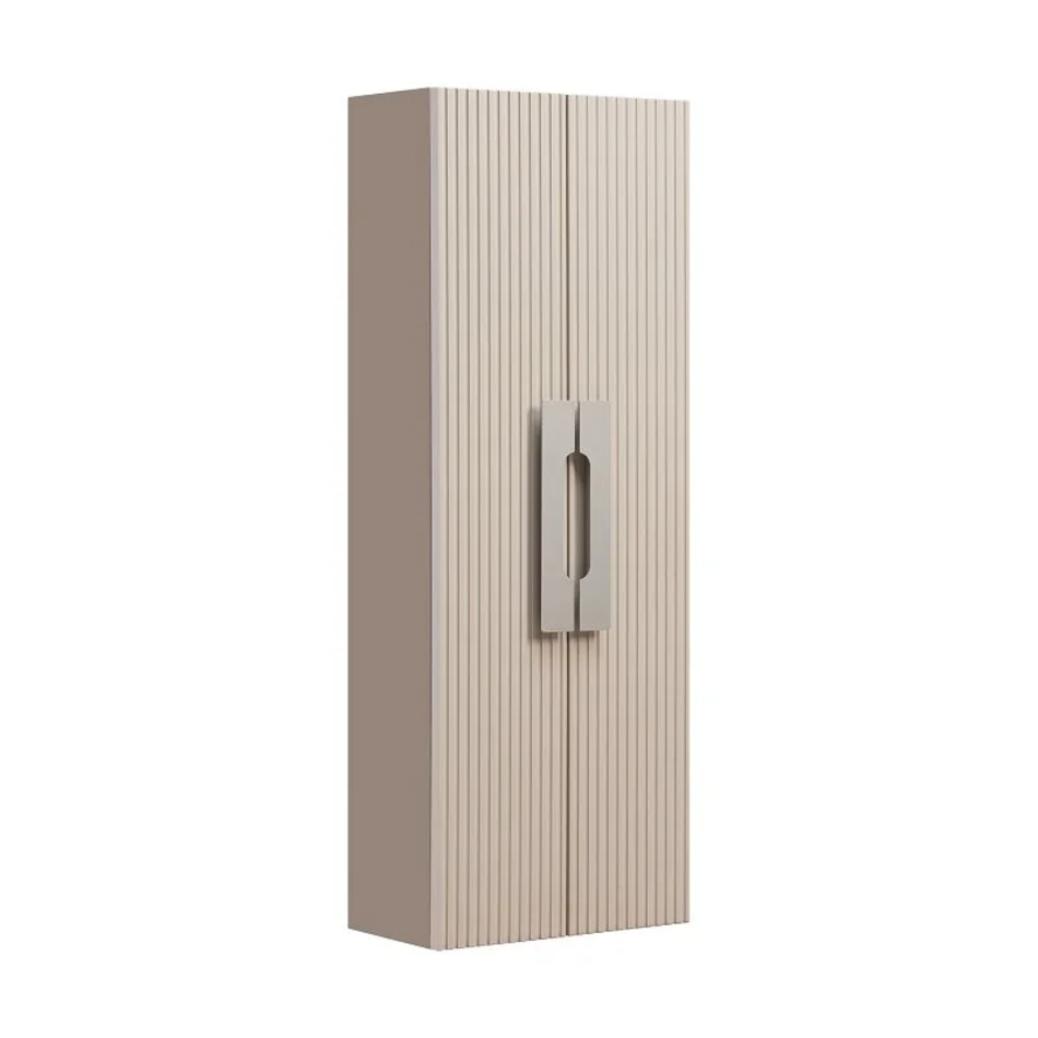 Двустворчатая шкаф-колонна выполнена из высококачественной МДФ, покрытой матовой пленкой. Вертикальная фрезеровка на фасадах создает эффект визуального увеличения высоты изделия, придавая ему элегантность и изящество.