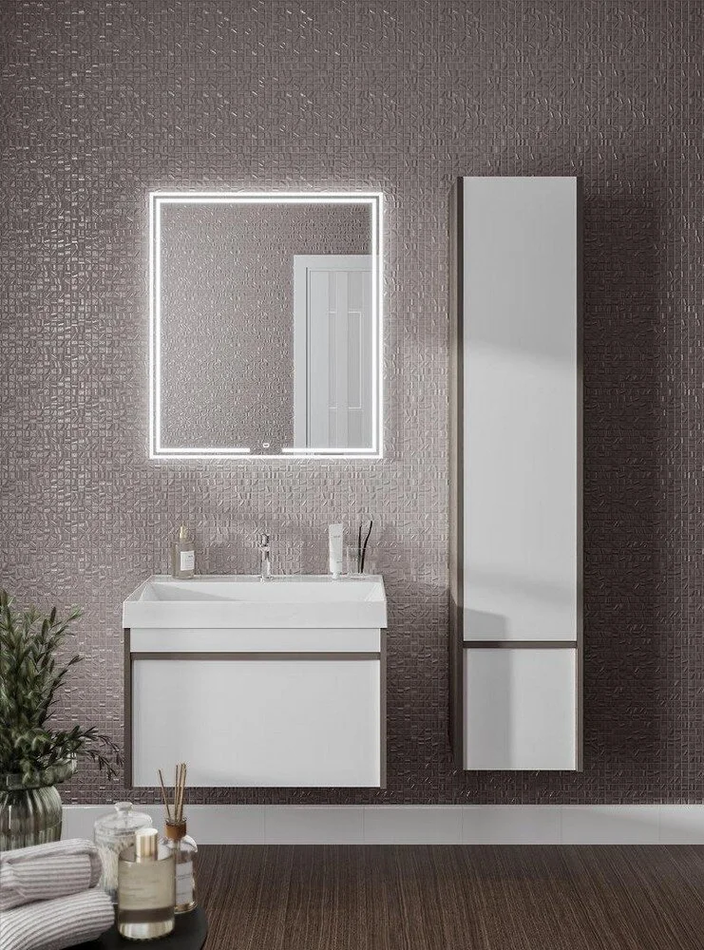Обстановку ванной комнаты можно дополнить подвесным пеналом MODULA с двумя отделениями. Основное — с фасадом Push-to-Open, внизу расположен выдвижной ящик. Модель выполнена с белой глянцевой отделкой и комплектуется дополнительной планкой в цвете «Арабика», которую на фасад можно установить вместо белой. Внутри расположены 3 стеклянные полочки и 2 полочки в цвете «лён антрацит».