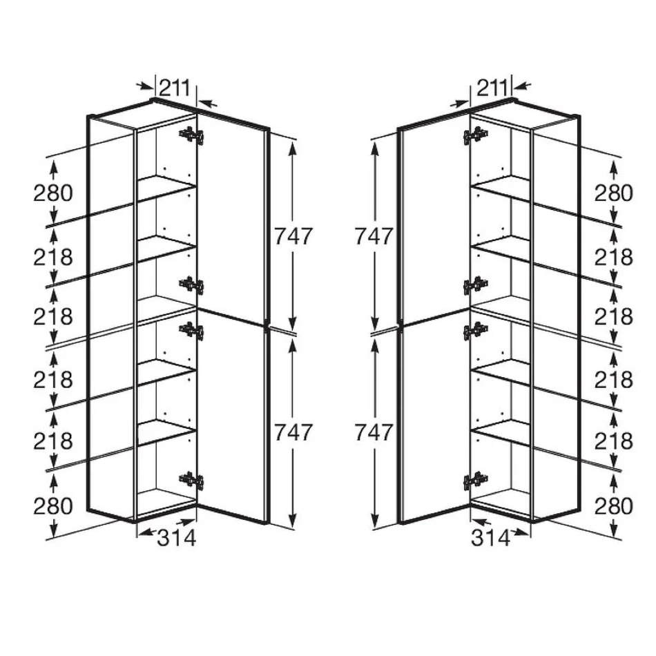 Дополняет комплект мебели OLETA шкаф-колонна в дизайне коллекции. Открытие фасадов осуществляется с помощью удобной профильной ручки. За фасадами, оснащенными петлями Hettich с плавным закрыванием, находятся регулируемые по высоте полочки из просветленного стекла.