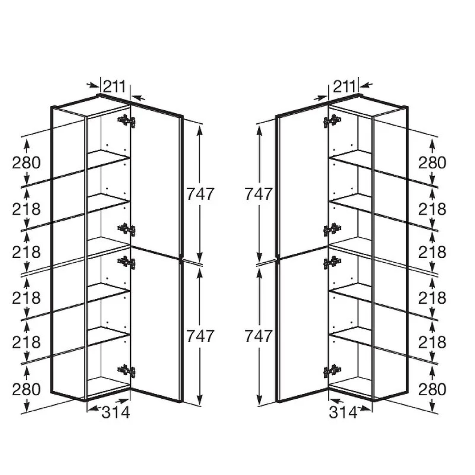 Дополняет комплект мебели OLETA шкаф-колонна в дизайне коллекции. Открытие фасадов осуществляется с помощью удобной профильной ручки. За фасадами, оснащенными петлями Hettich с плавным закрыванием, находятся регулируемые по высоте полочки из просветленного стекла.