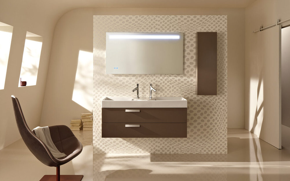 линиями и мощными точными углами. Новая мебель из коллекции Rythmik предлагает дополнительное место для хранения туалетных принадлежностей и предметов для комфортного ухода за собой и радует глаз стильными геометрическими очертаниями.