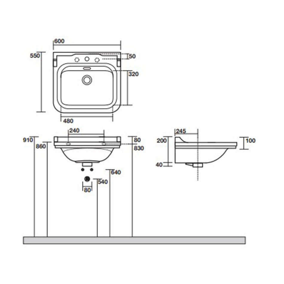 Раковина керамическая Kerasan Waldorf 4140K1bi/cr*3 60 х 55 см, 3 отверстия под смеситель, белая, заглушка хром