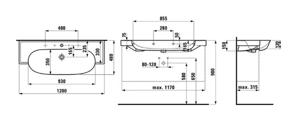 Раковина Laufen New Classic 8.1385.8.400.115.1 120 х 48 х 16.5 см, SaphirKeramik, LCC, 2 отверстия, без перелива, белый глянцевый
