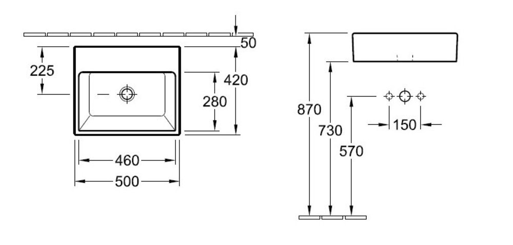 - Рекомендация: монтаж с минимальным расстоянием между задней стенкой умывальника и стеной 50 мм