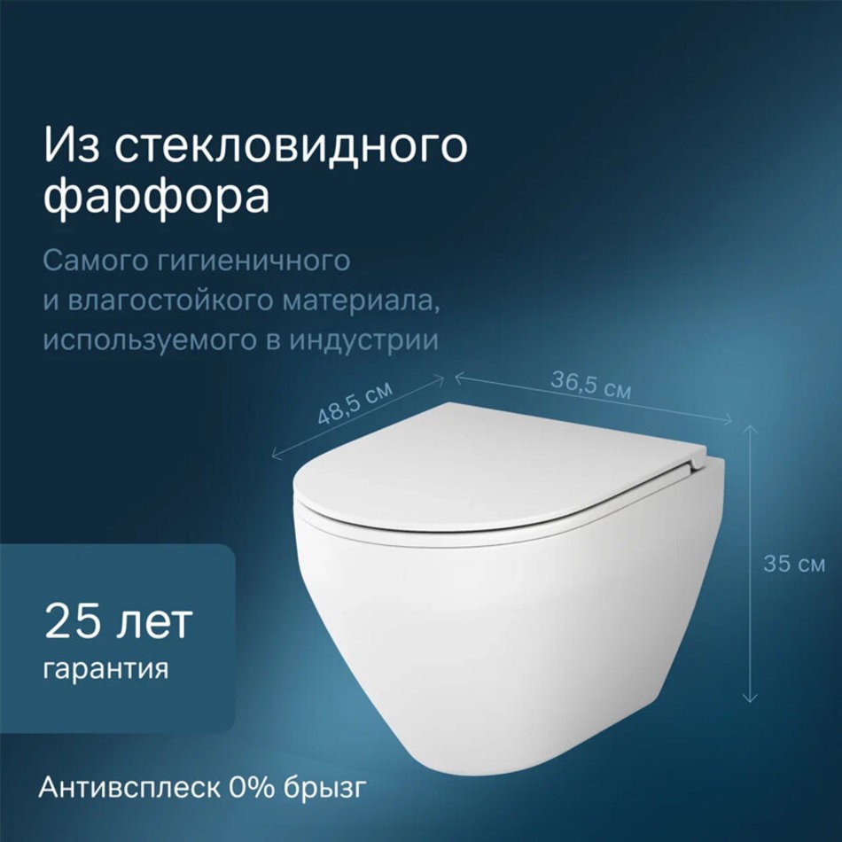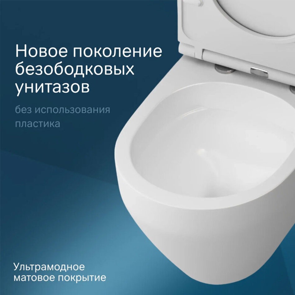 - Белый матовый унитаз имеет безупречную поверхность - изготовлен из стекловидного фарфора, самого гигиеничного и влагостойкого материала.