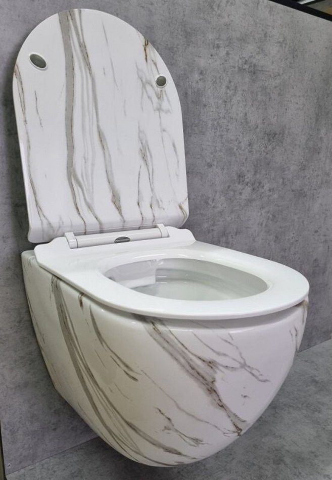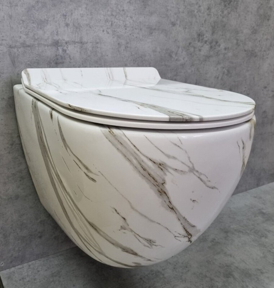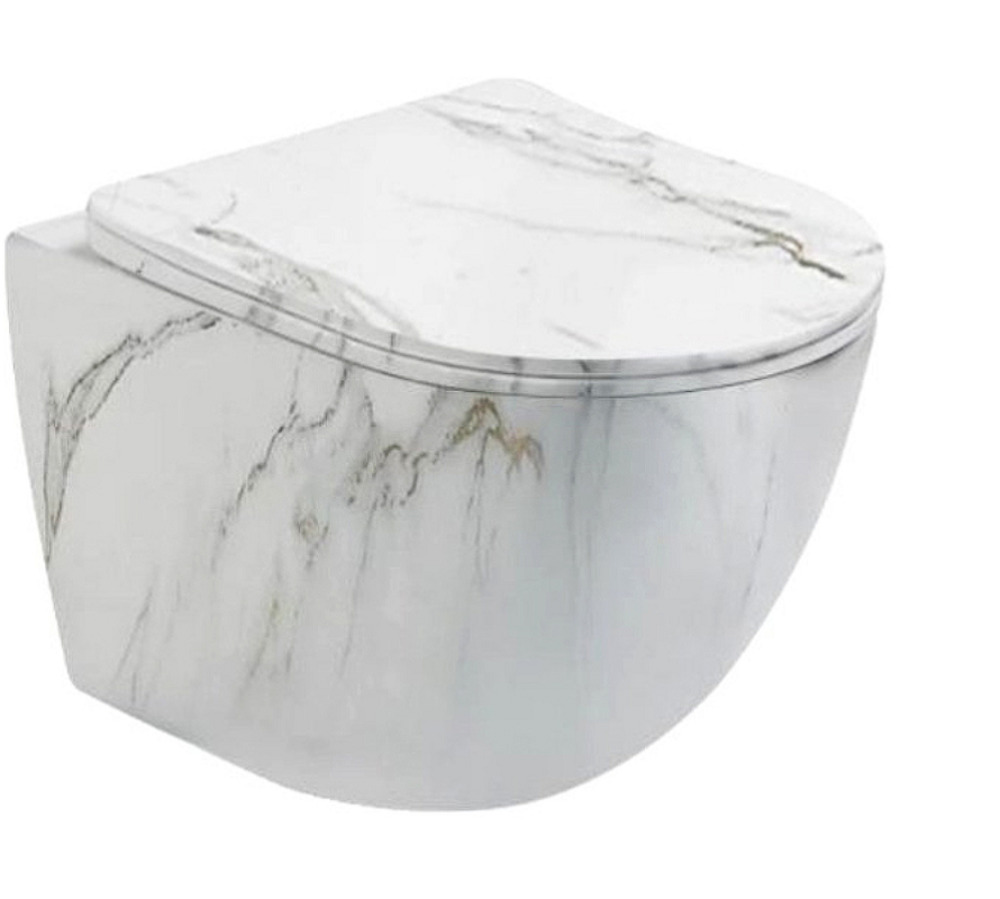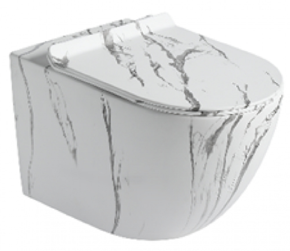 Подвесной унитаз Ceramalux безободковый, крышка микролифт, белый мрамор, 2213-K