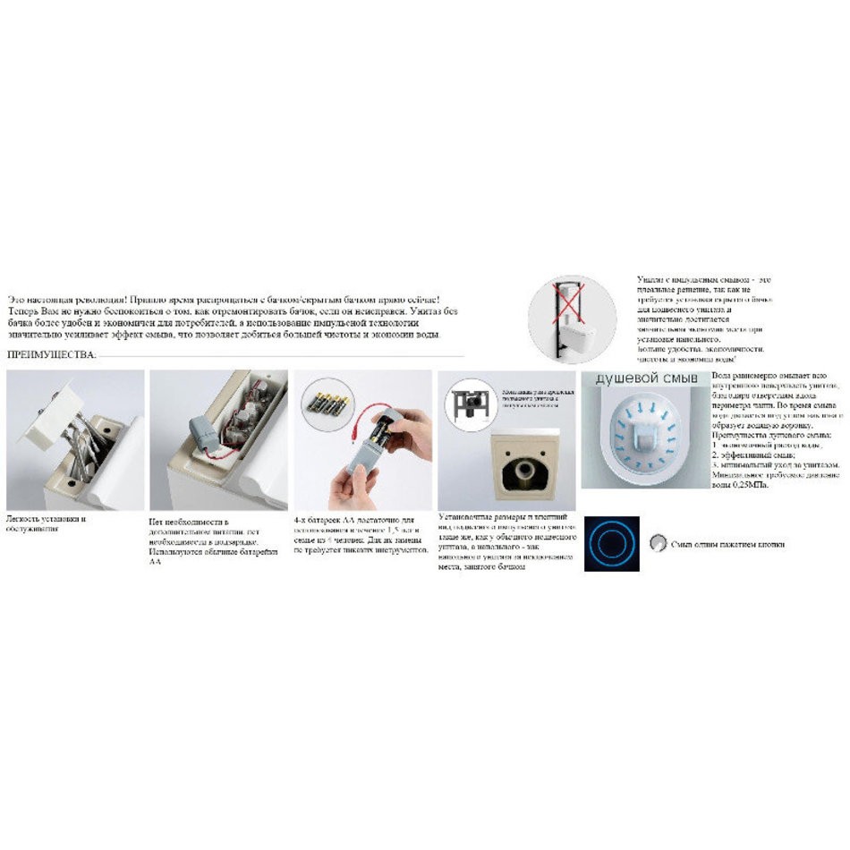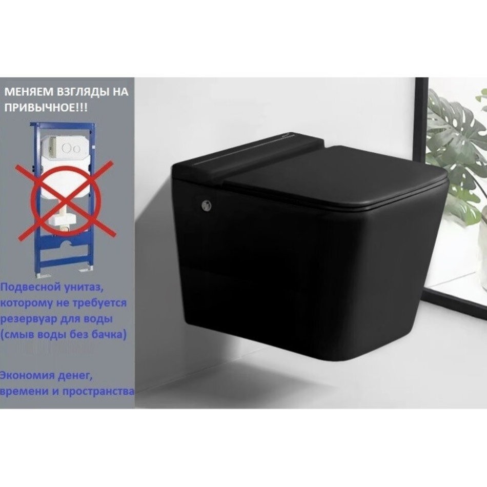 Стильный черный унитаз с импульсным сливом. Не требуется емкость для воды. Экономия при сливе до 30% по сравнению со стандартными унитазами. Мощный и чистый слив. Адаптирован под российскую канализацию. Подвесной безободковый унитаз с функцией импульсного смыва и дюралопластовым сиденьем с плавным опусканием.