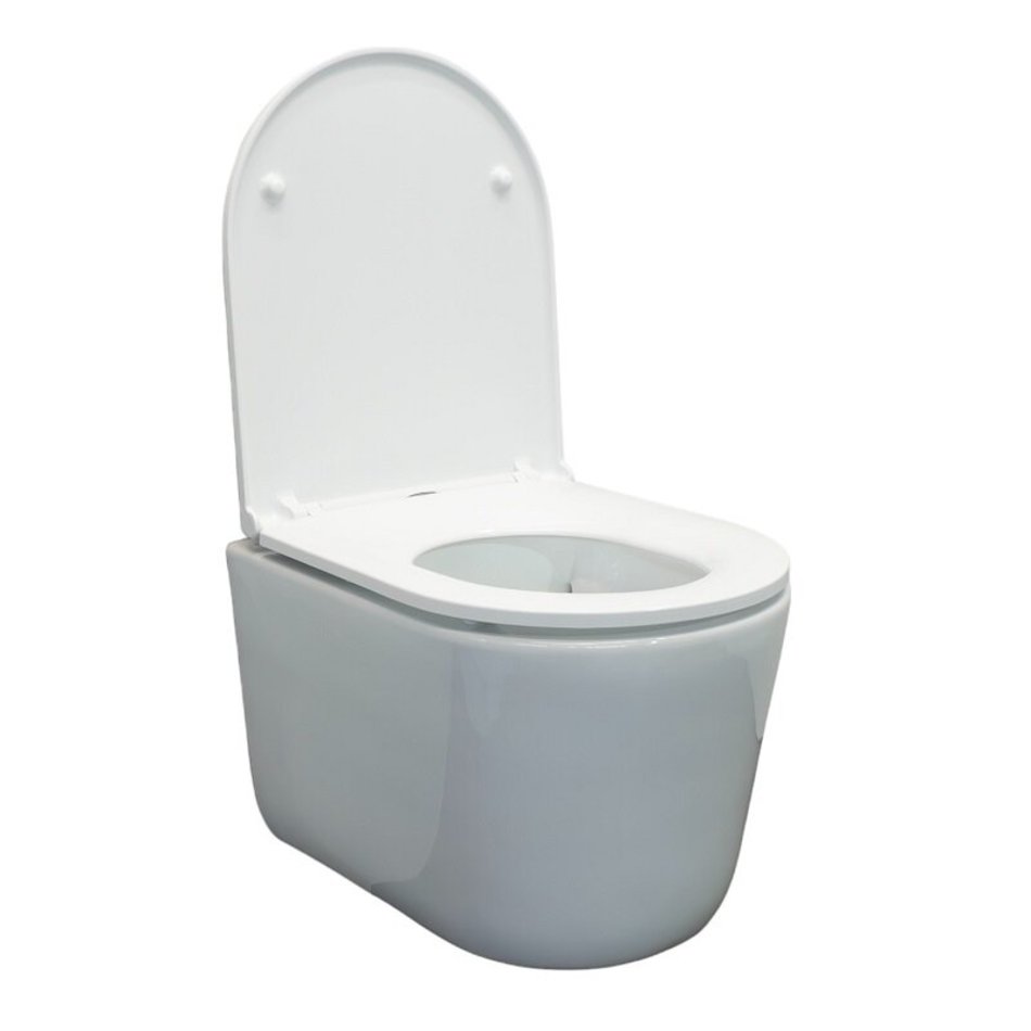 - Безободковый подвесной унитаз Comforty CF3C789WH с антибактериальной легкосъемной крышкой-сиденьем с функцией плавного закрывания.
