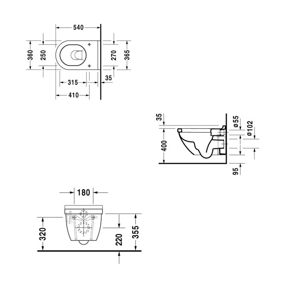 - Унитаз Duravit Starck 3 2225090000: Ш365*Г540*В340 мм, подвесной, выпуск - горизонтальный (универсальный), безободковый - нет, материал - фарфор, система "Антивсплеск", цвет - белый