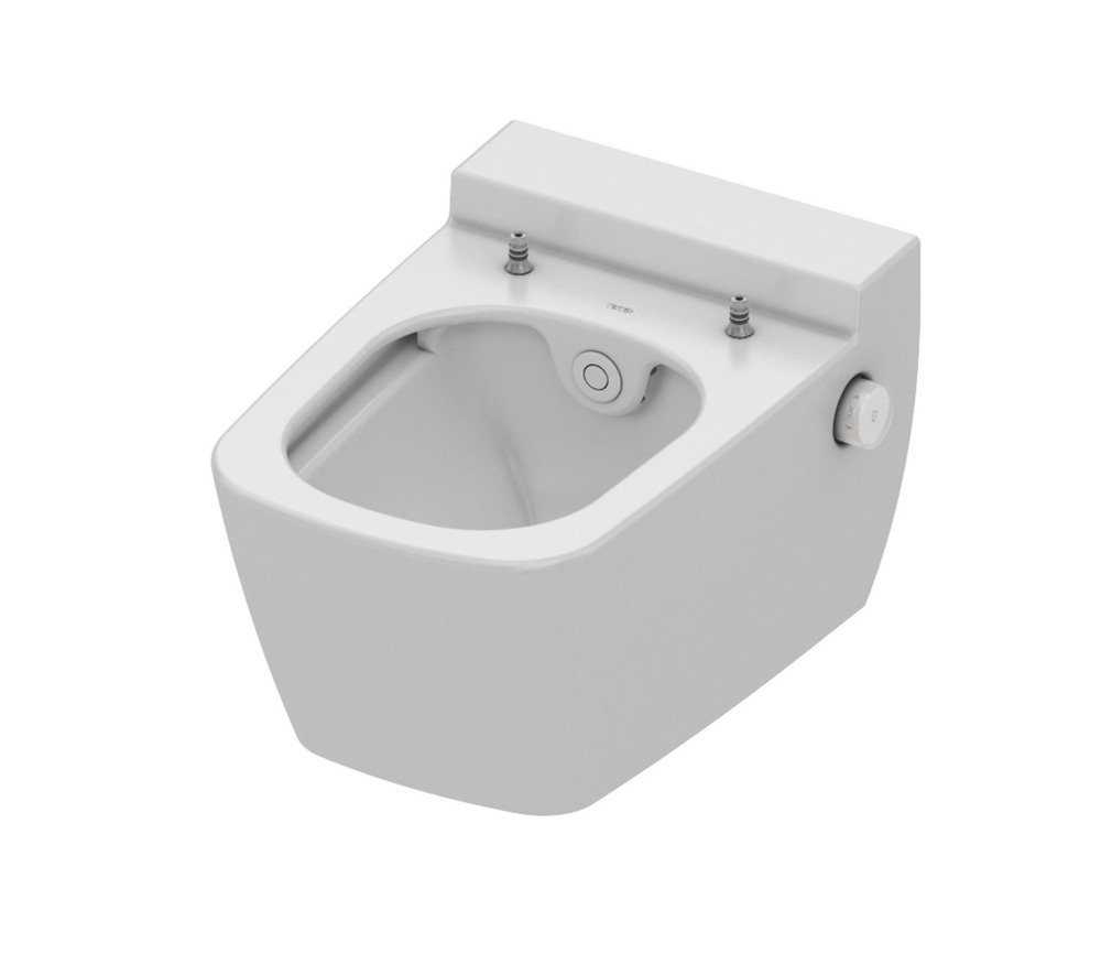 Подвесной безободковый унитаз со встроенным гигиеническим душем. Гигиенический душ функционирует без использования электричества, необходимо подключение к горячей и холодной воде.