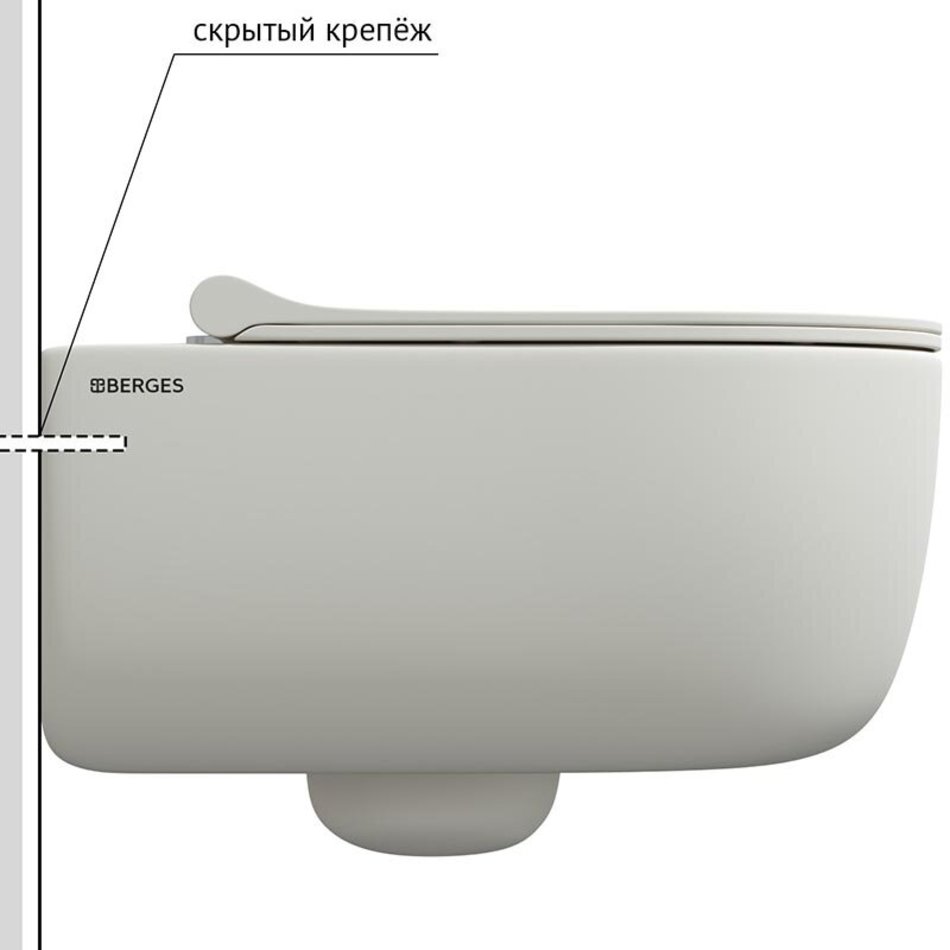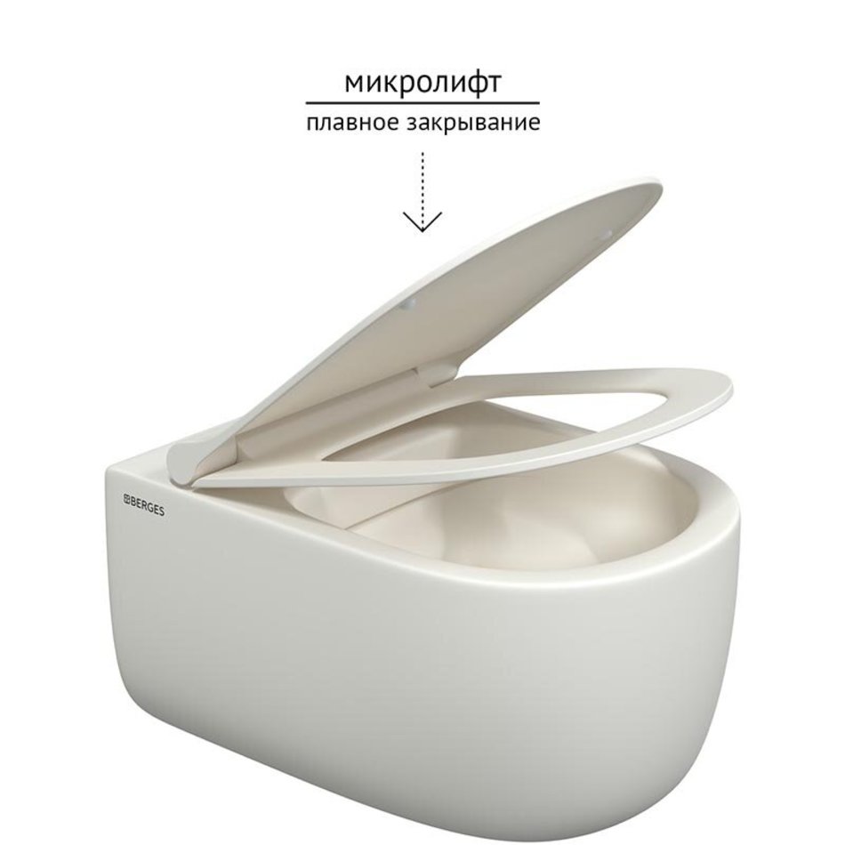 Унитаз BERGES подвесной EGO XL матовый белый Rimless 54 см, сиденье EGO XL Slim SO матовый белый, микролифт , быстросъем, 082228