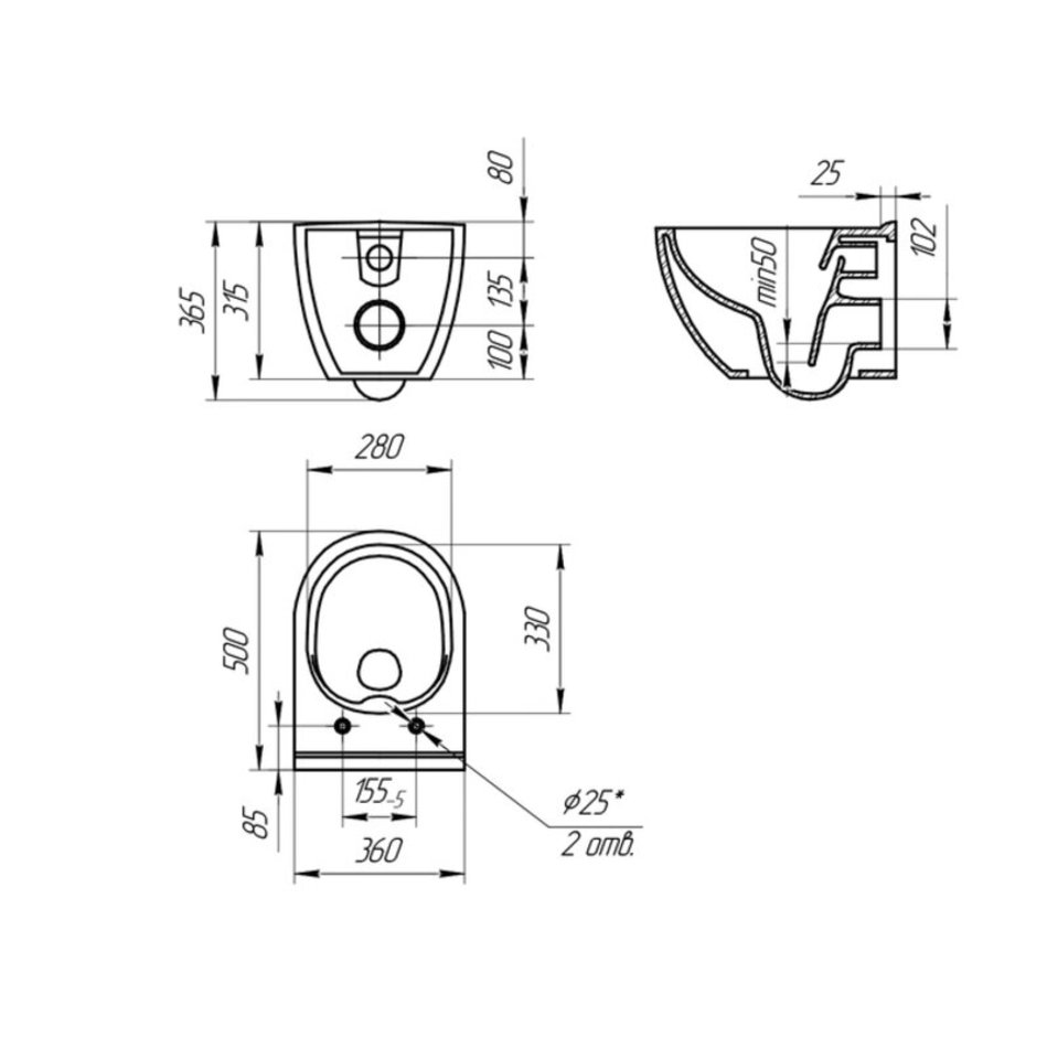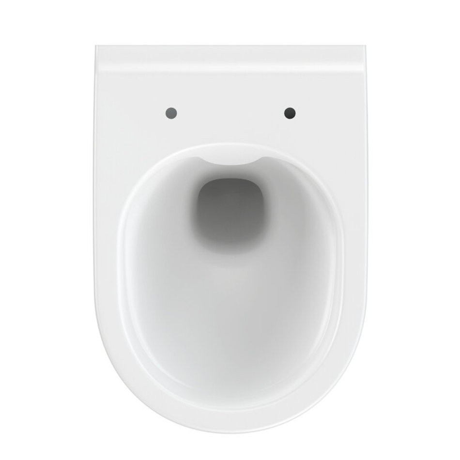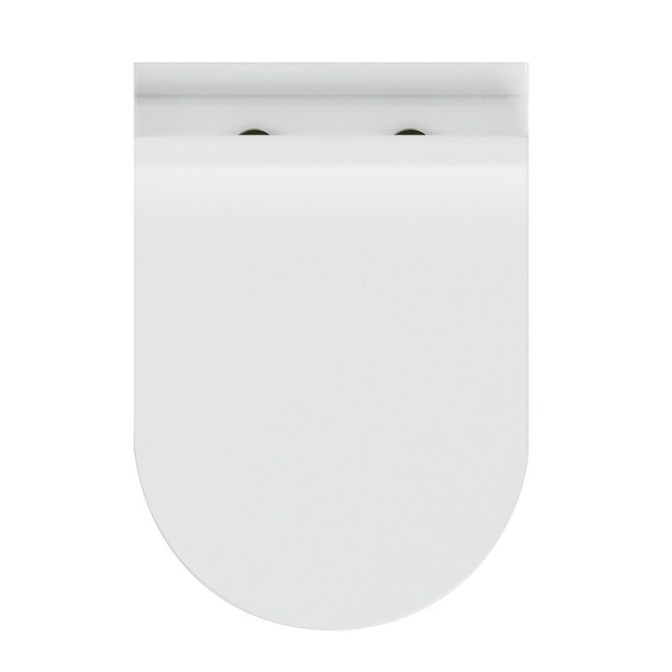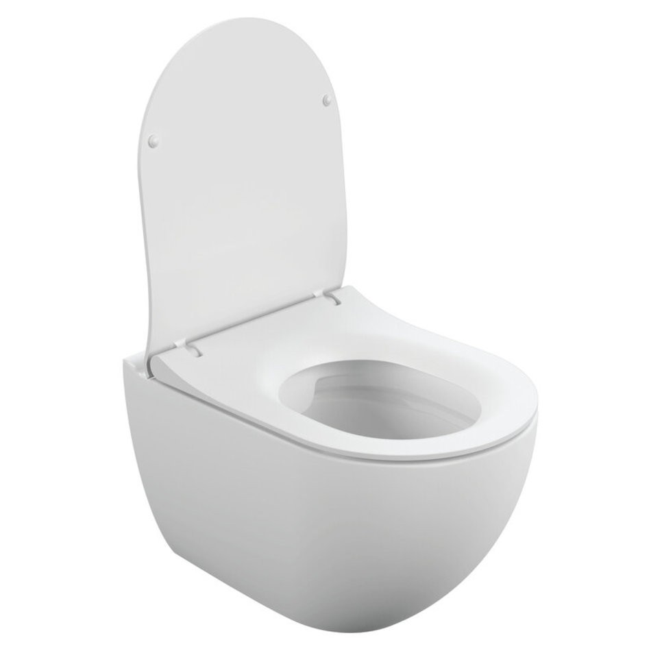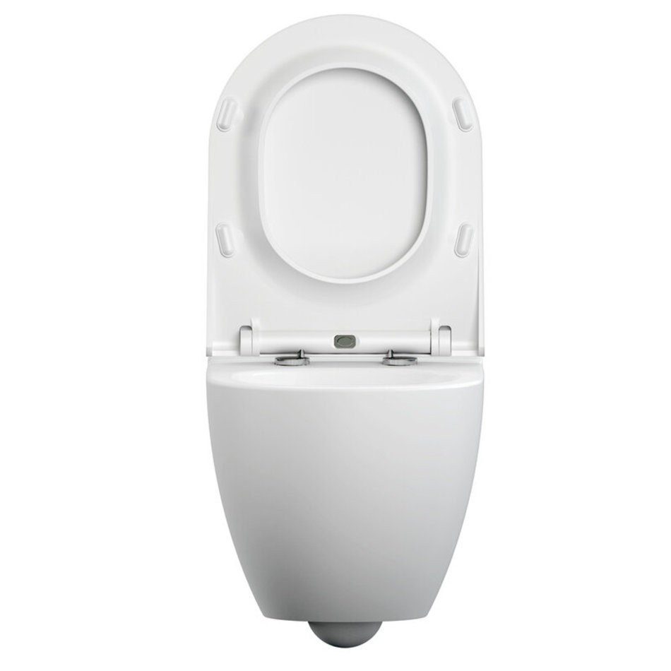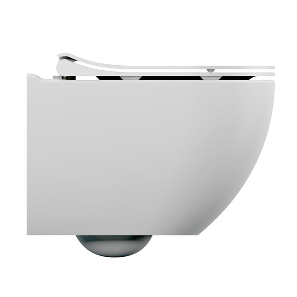 Безободковый подвесной унитаз с ультратонким, антибактериальным сиденьем с плавным закрыванием и легкосъемным механизмом.
