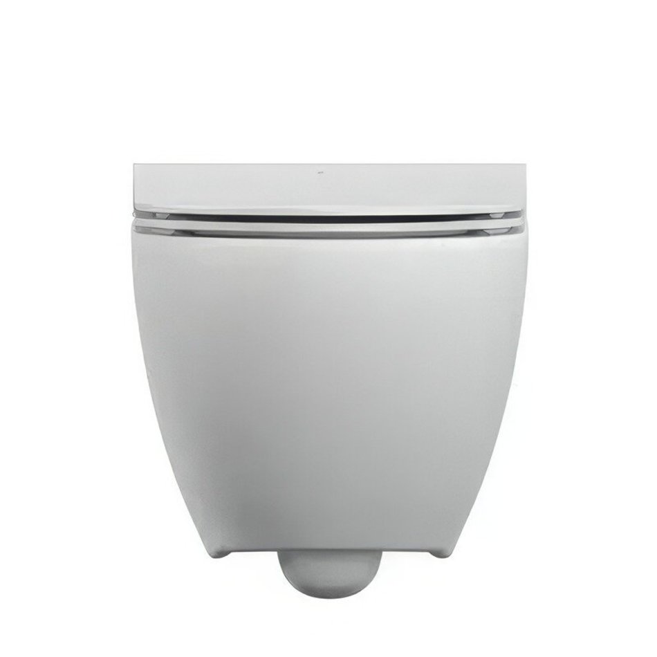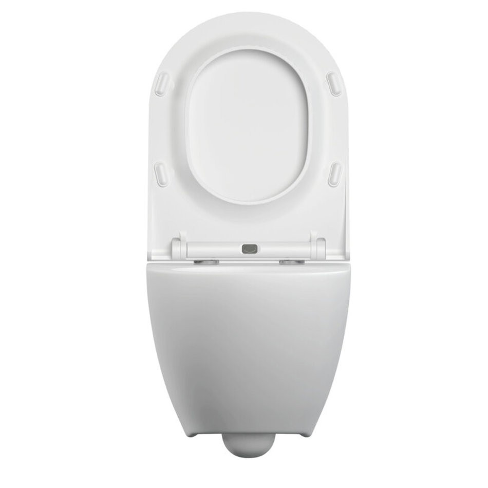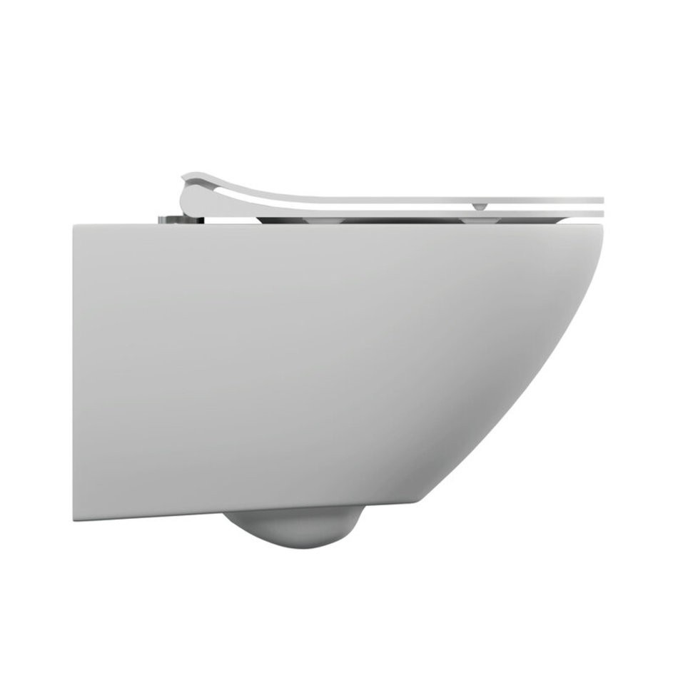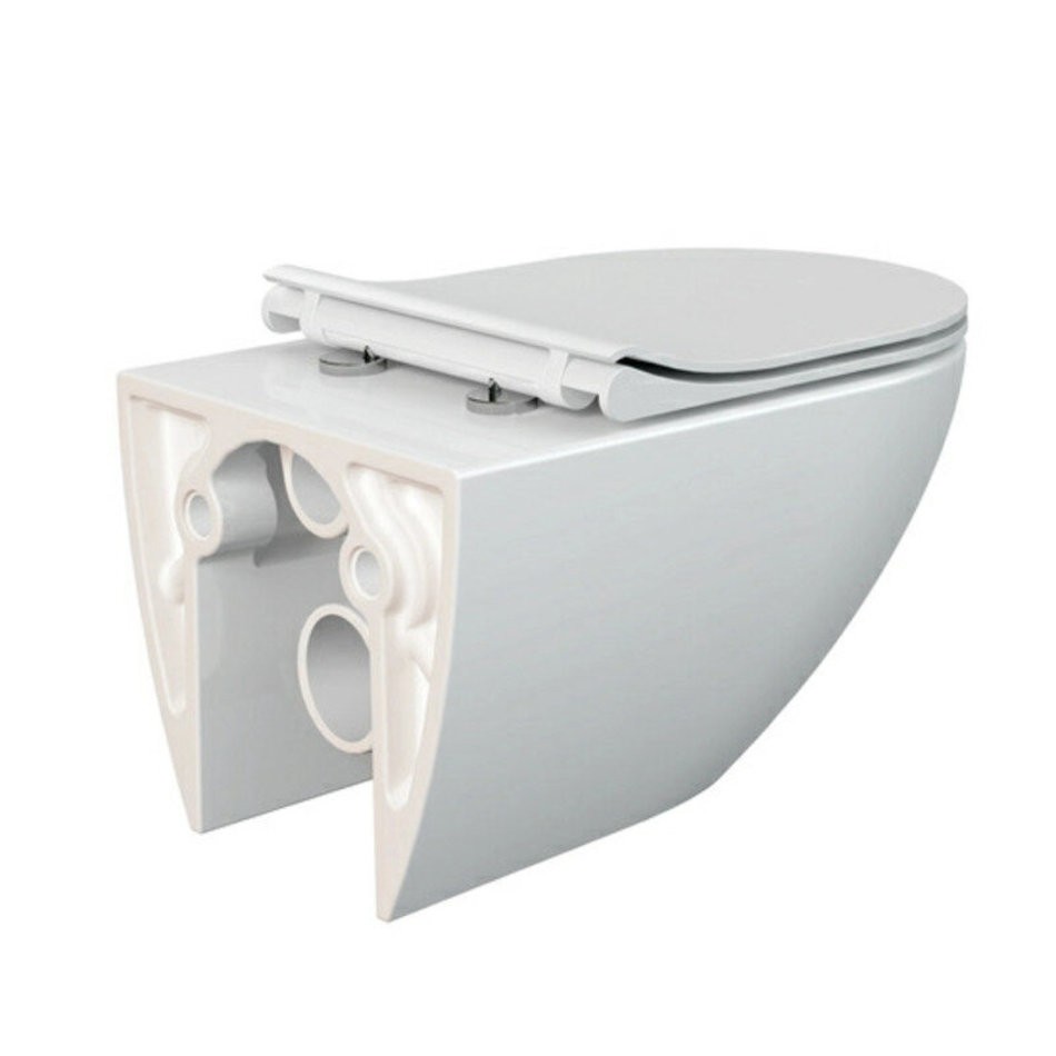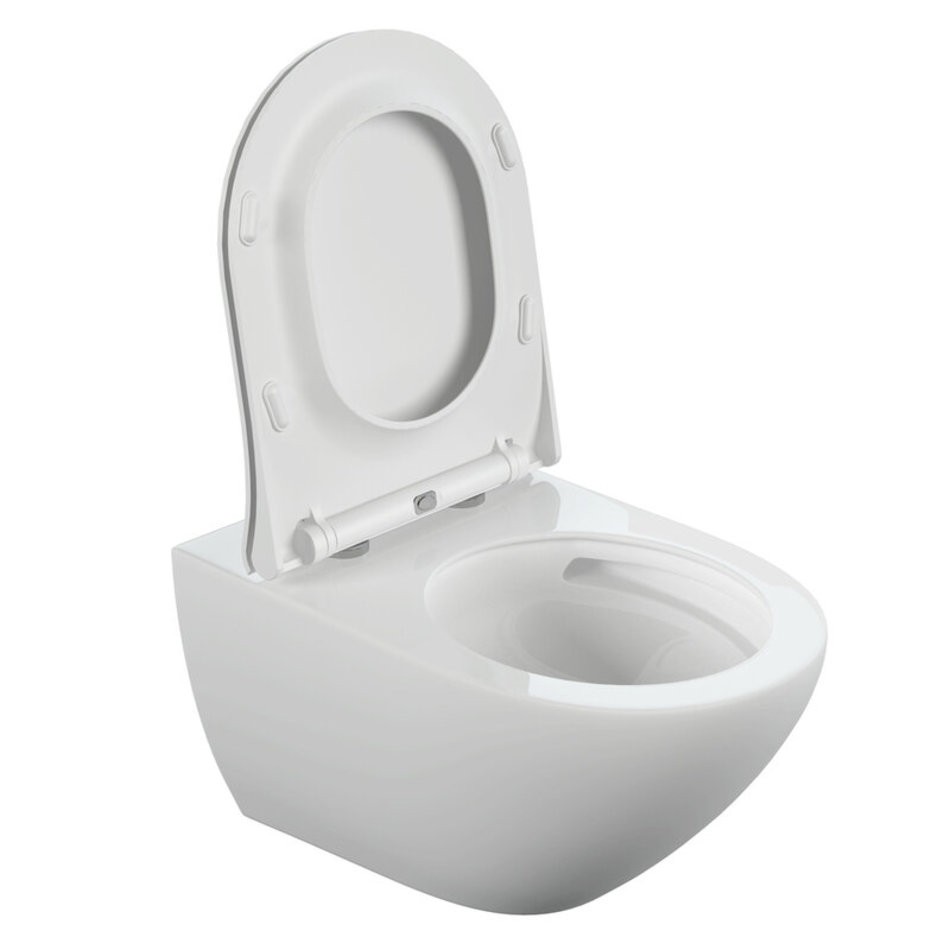 Безободковый подвесной унитаз с ультратонким, антибактериальным сиденьем с плавным закрыванием и легкосъемным механизмом.