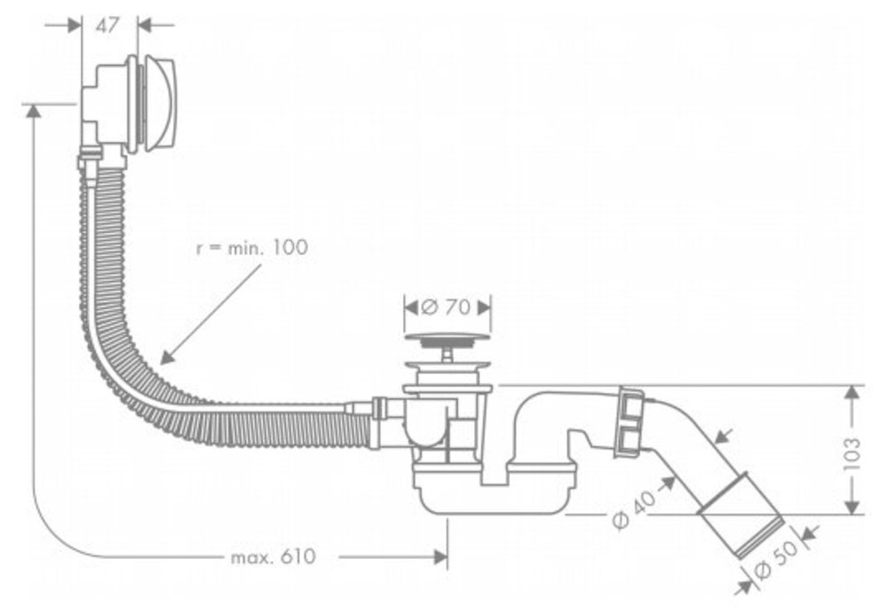 Подходит для стандартных ванн;Резьбовое соединение из ПЭ G 1 ½ x 40/50 мм;Гибкий шланг перелива;Длина боуден-троса 520 мм;Состоит из: Слив/перелив Flexaplus, для ванн и душевых поддонов, скрытая часть, 1½’ (58140180); Flexaplus внешняя часть (58185000).