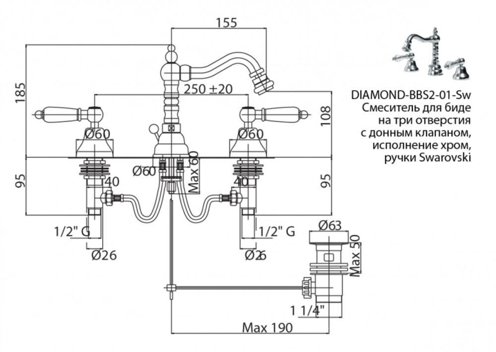 Смеситель Cezares DIAMOND-BBS2-02-Sw для биде, бронза, ручки Swarovski