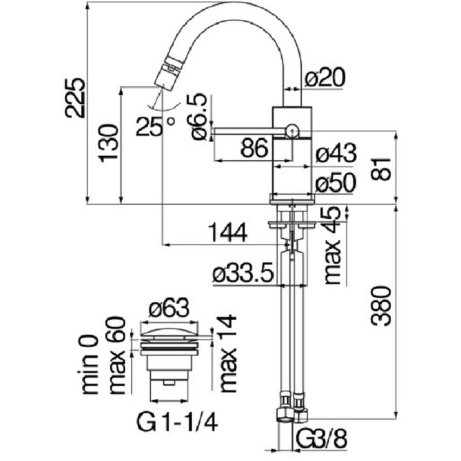 Смеситель для биде (красное золото). Ограничитель мощности с открытием в холодной воде. Аэратор против известковых отложений M 20 x 1, 5 l/min. Шарнирный излив. Шарнирная форсунка. Нажимной слив ø 1 1/4”. Шланг из нержавеющей стали ø 3/8”.