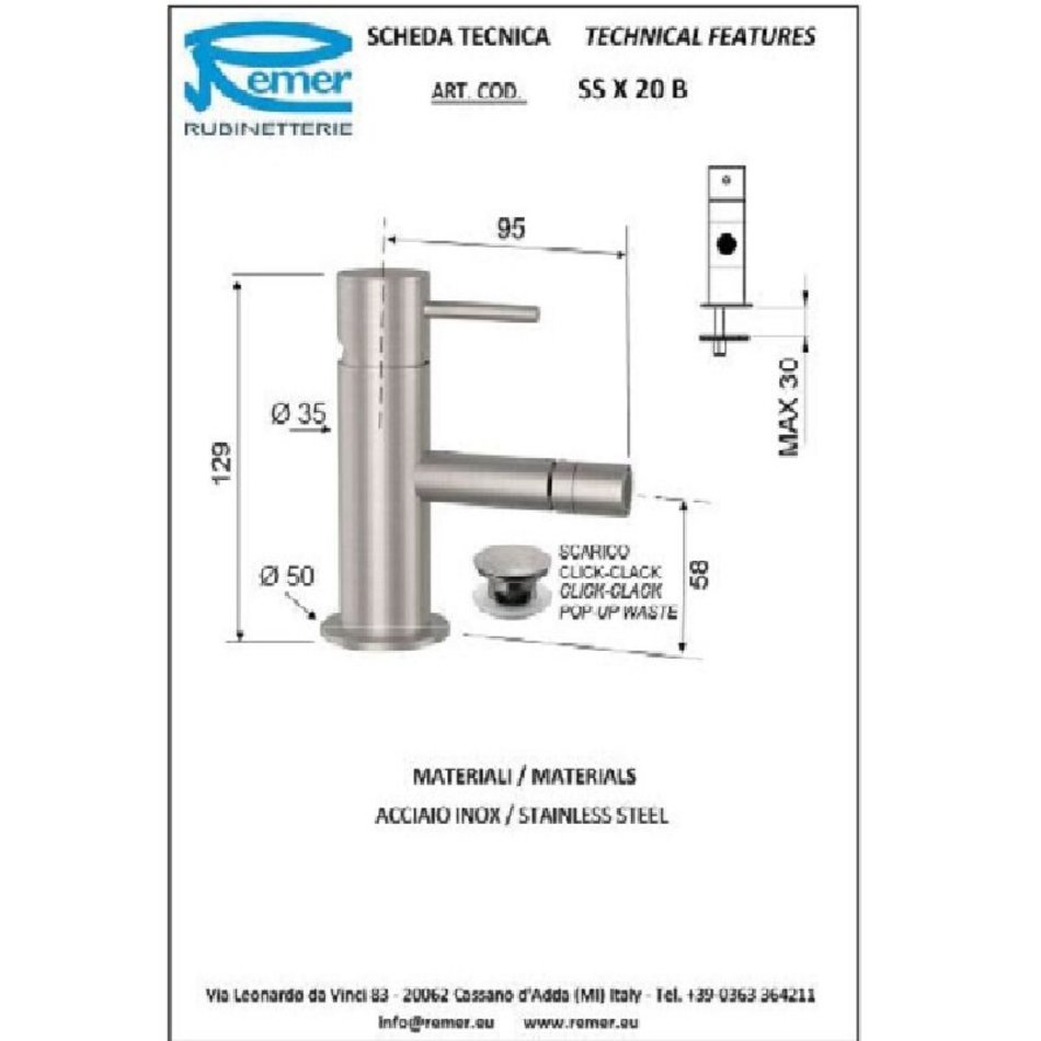 Смеситель Remer X Style Inox SSX20B для биде, с донным клапаном, цвет шлифованная нержавеющая сталь