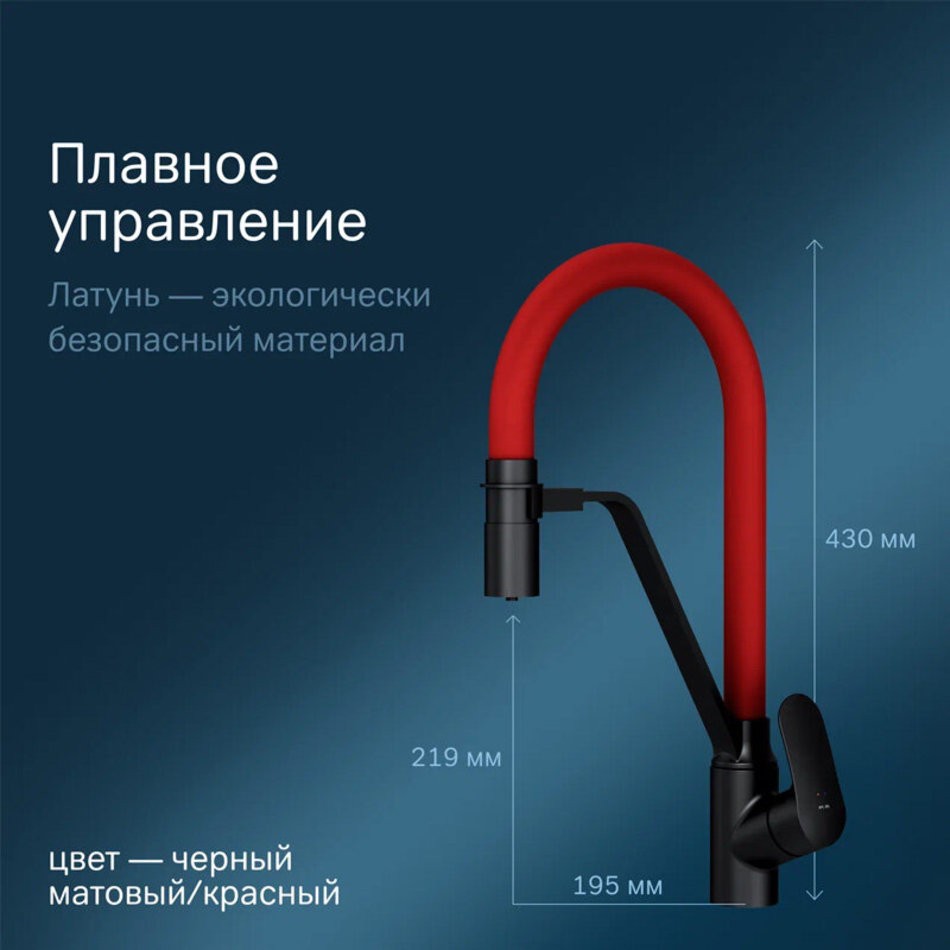 Эффектное сочетание цветов - матовый черный корпус смесителя и синий цвет излива станет ярким дизайнерким решенем на кухне.