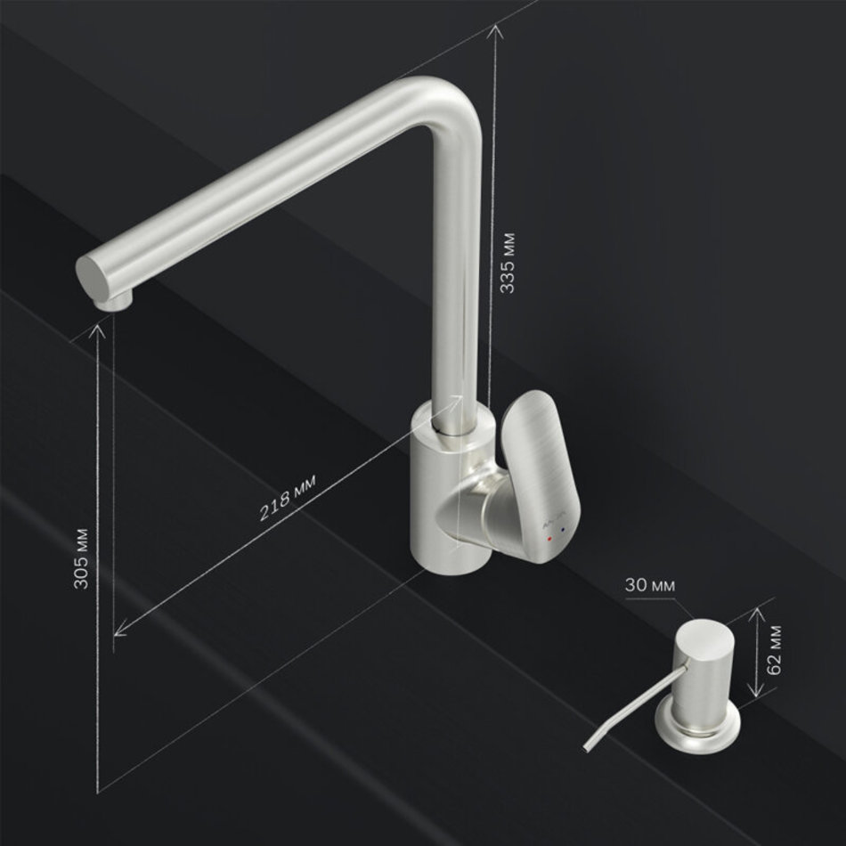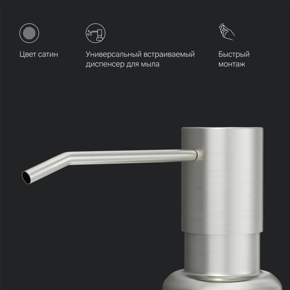 В набор 2в1 также входит универсальный встраиваемый диспенсер для мыла. Это незаменимый аксессуар, который выполняет несколько функций. Во-первых, экономия расхода моющего средства или жидкого мыла. Во-вторых, избавляет от визуального шума. Диспенсеры произведены из нержавеющей стали, устойчивой к коррозии. Плавный ход механизма помпы гарантирует приятное взаимодействие с продуктом. Длина носика составляет 75мм, поэтому будет удобна для использования на любом типе и размере раковины.