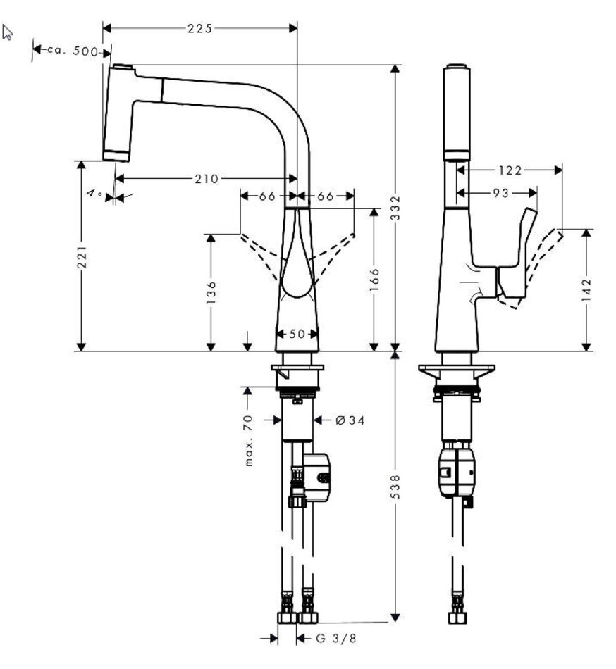 - угол поворота излива: регулировка на 2 уровня, на 110° или 150°