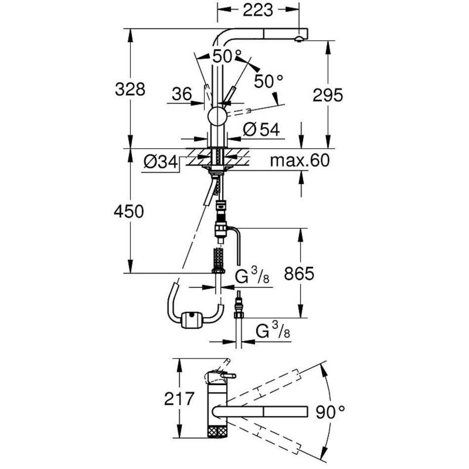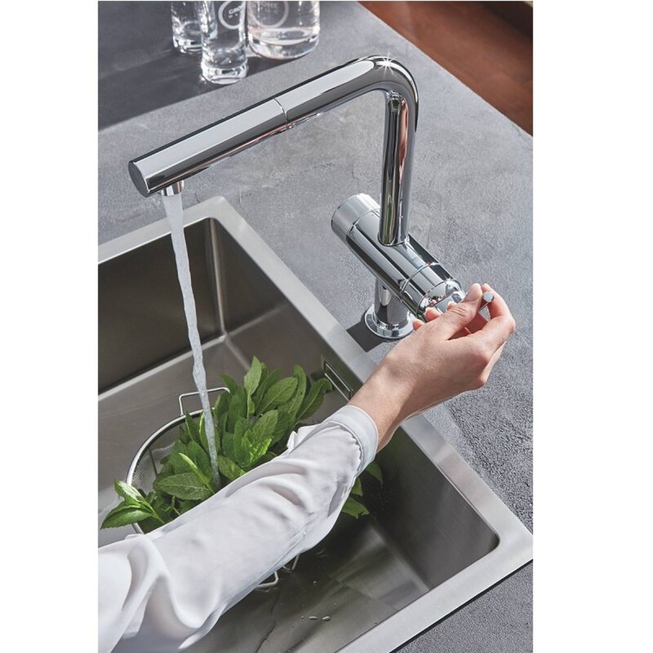 Монтаж на одно отверстие.L-образный излив.Выдвижной излив с аэратором.Отдельная рукоятка для фильтрованной воды.Керамический вентиль 1/2".GROHE StarLight хромированное покрытие поверхности.GROHE SilkMove керамический картридж Ø 46 мм.Поворотный трубкообразный излив.Диапазон поворота 90°.Отдельные водотоки для питьевой и водопроводной воды.Гибкая подводка.Фильтры и переходники к ним приобретаются отдельно.Можно использовать с 40438001 - фильтр с переходником и счетчиком.