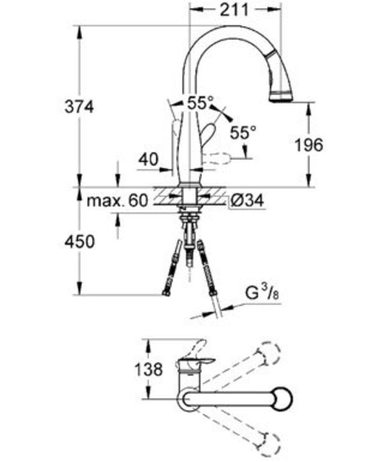 - профессиональная выдвижная лейка с переключателем аэратор/душевая струя