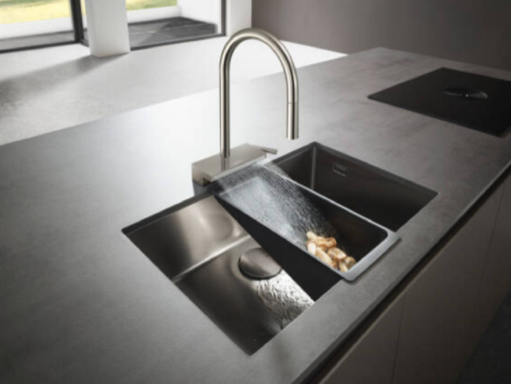 - состоит из: однорычажный кухонный смеситель, многофункциональный дуршлаг