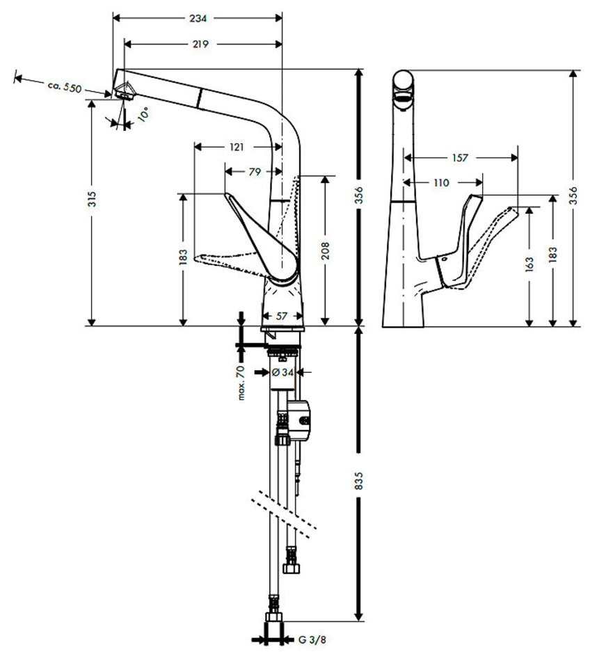 - угол поворота излива: регулировка на 2 уровня, на 110° или 150°