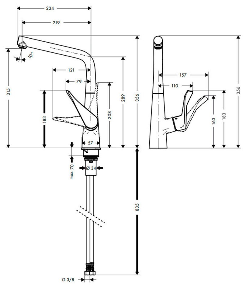 - угол поворота излива: регулировка на 3 уровня, на 110°, 150° или 360°