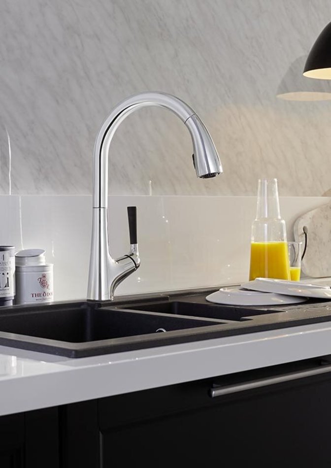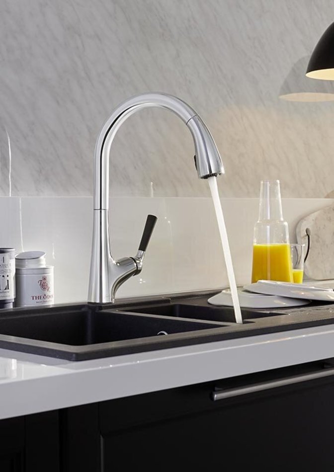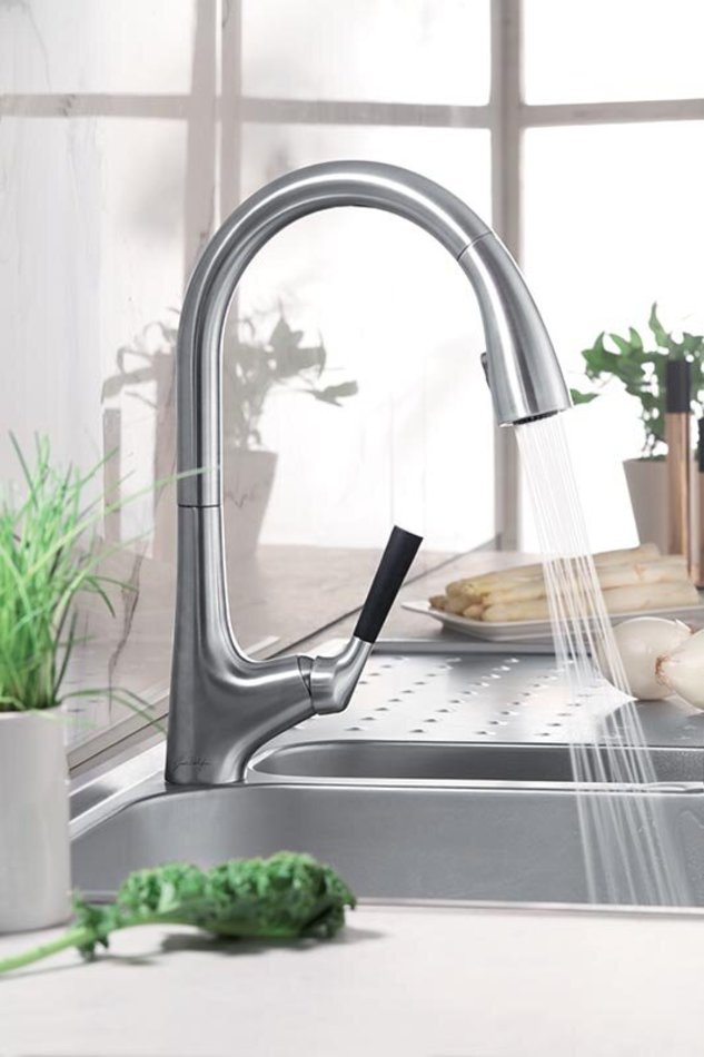 Технология ProMotion: Вытяжной излив, установленный на шарнире, обеспечивает легкость использования