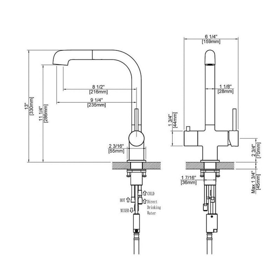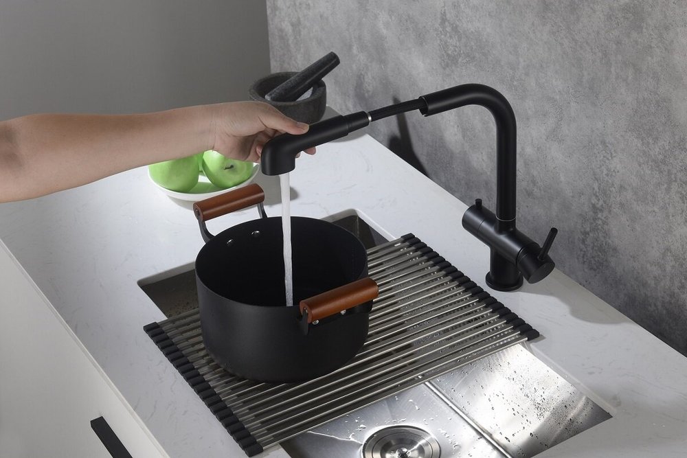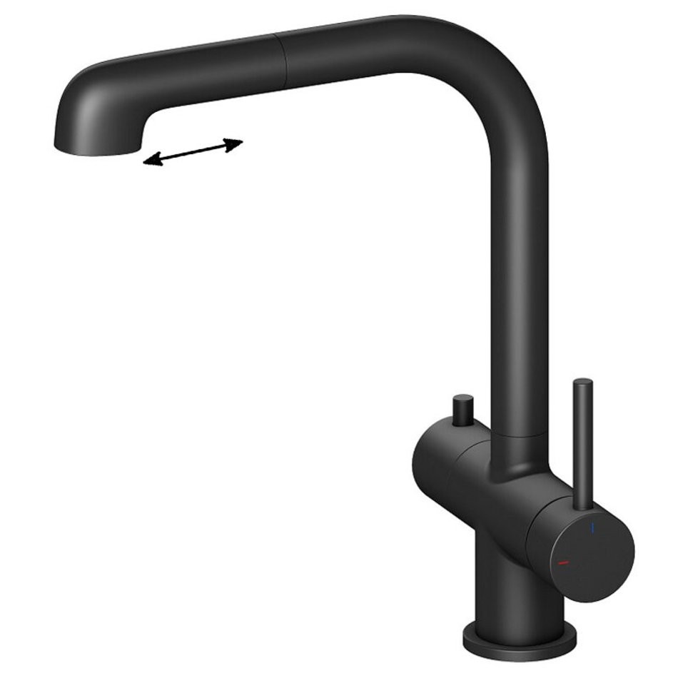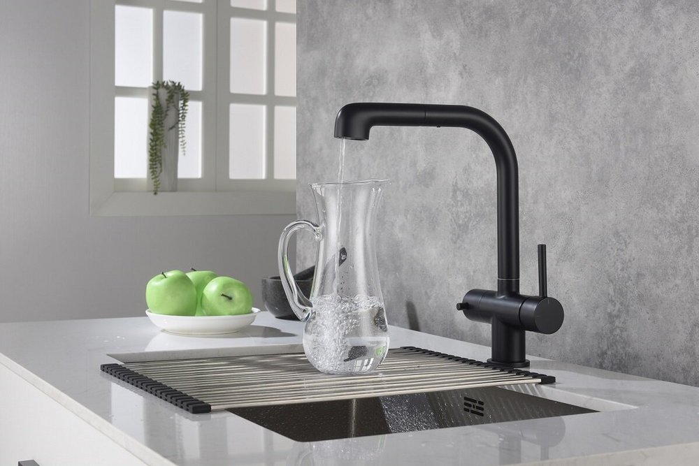 - Смеситель для кухни с выдвижным изливом и возможностью подключения фильтра для питьевой воды