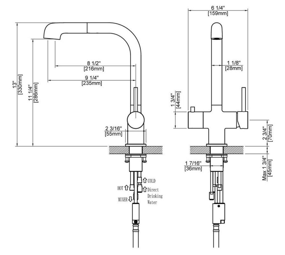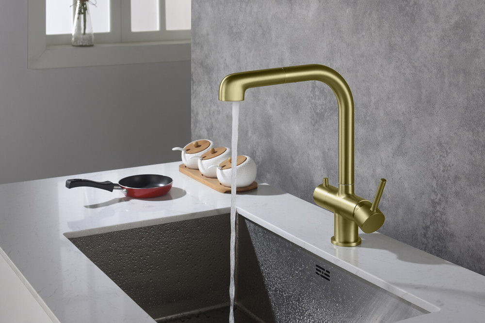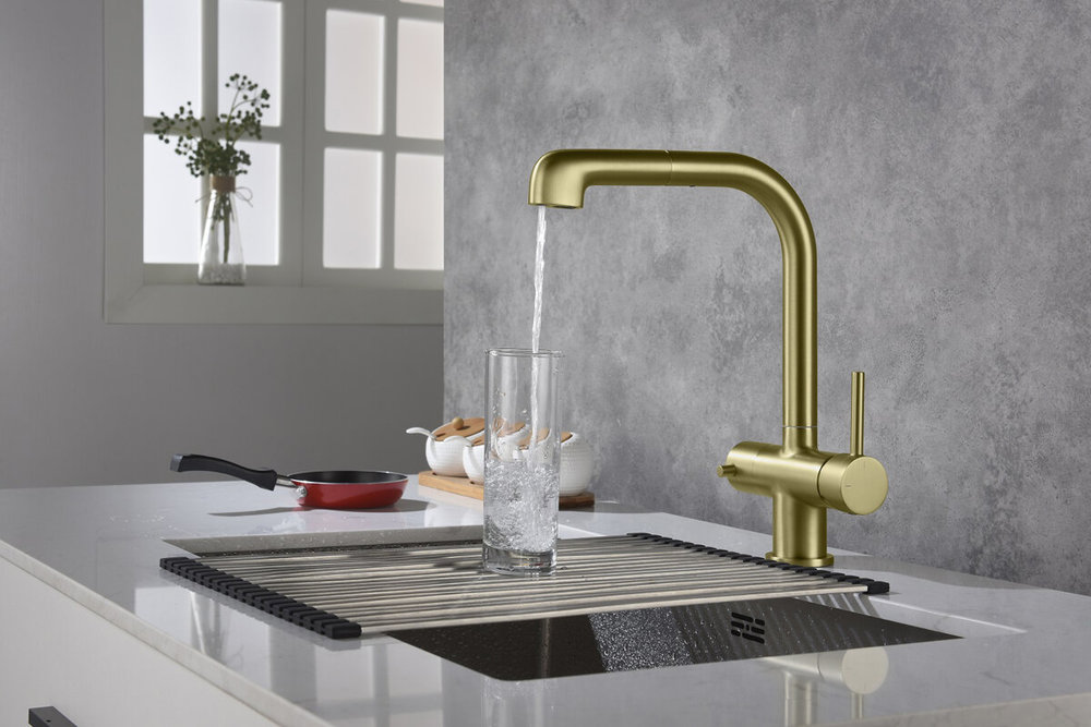 - Смеситель для кухни с выдвижным изливом и возможностью подключения фильтра для питьевой воды
