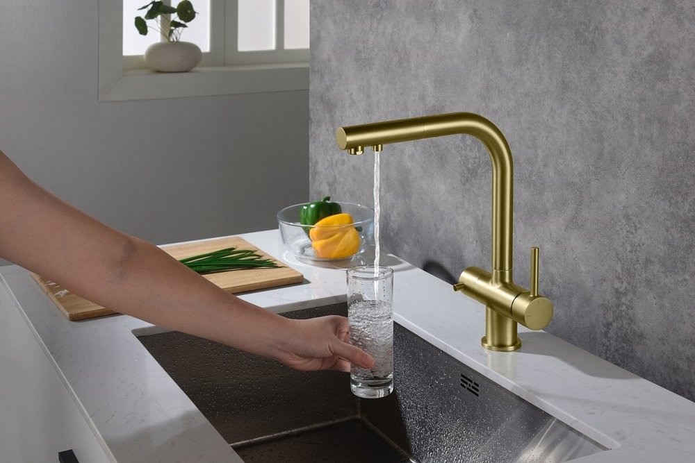 - Смеситель для кухни с выдвижным изливом и возможностью подключения фильтра для питьевой воды