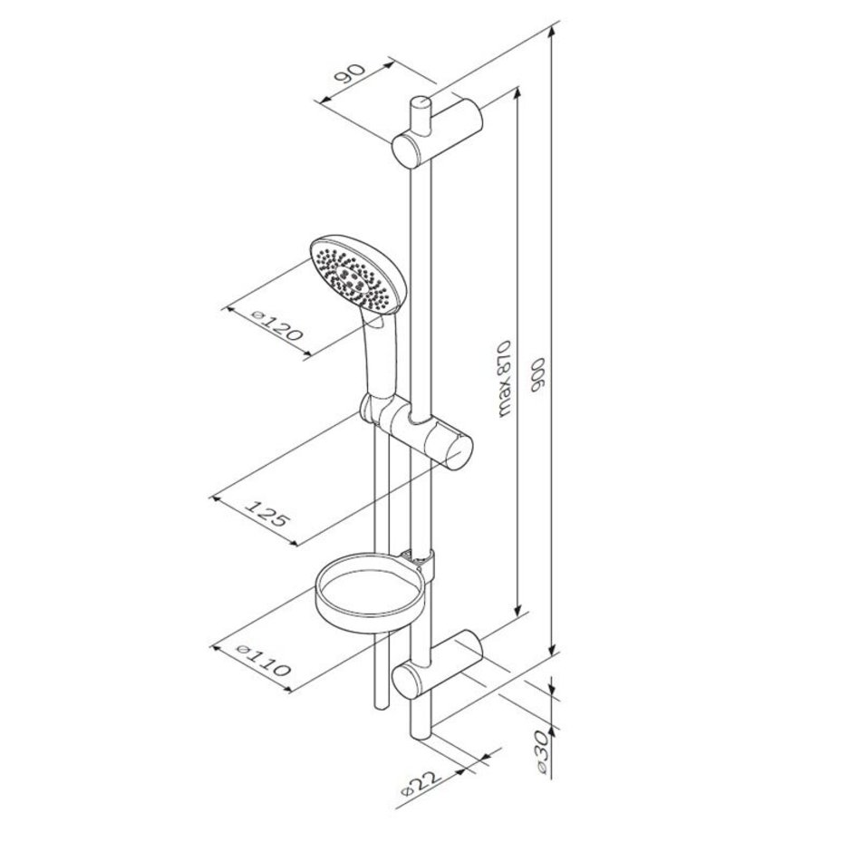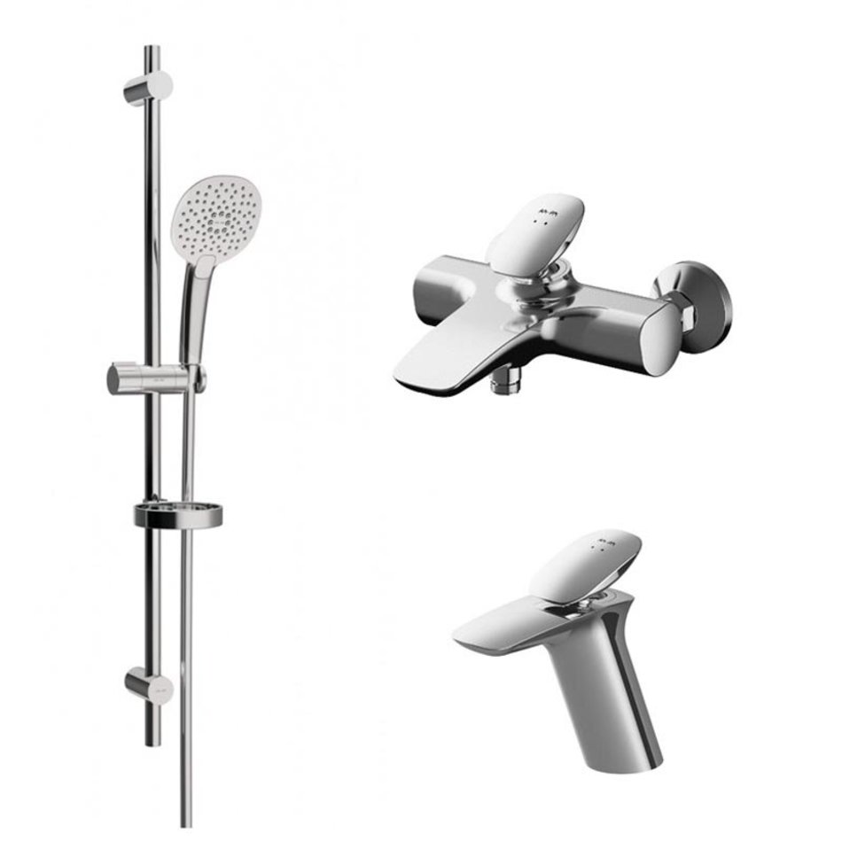 Набор смесителей для ванной комнаты: смеситель для раковины, смеситель для ванны/душа, душевой комплект: душевая штанга 900 мм, душевой шланг 1750 мм, ручной душ 120 мм, мыльница Ø 110 мм, регулируемые по высоте держатели душевой штанги, 3 режима ручного душа (Spray, EnerJet, Spray + Massage), переключатель режимов Simple Switch Push, функция Rub&Clean для легкой очистки душевых форсунок, регулируемый в трех плоскостях держатель ручного душа, шарнирное соединение защищает душевой шланг от перекручивания.