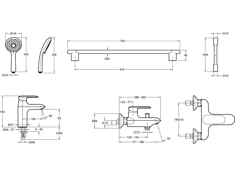 - Душевой гарнитур: штанга 70 см, душевая лейка 11.6 см, шланг 160 см, мыльница