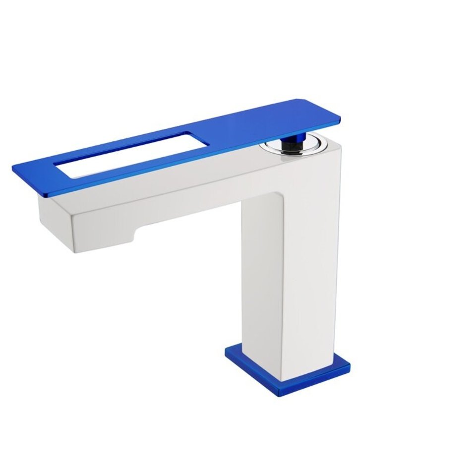 Смеситель выполнен в современном квадратном дизайне. Он изготовлен из латуни, имеет стойкое покрытие в белом и синем цвете. Изделие отличается плоской широкой ручкой для удобной настройки напора и температуры воды. Для смешивания воды используется долговечный керамический картридж.
