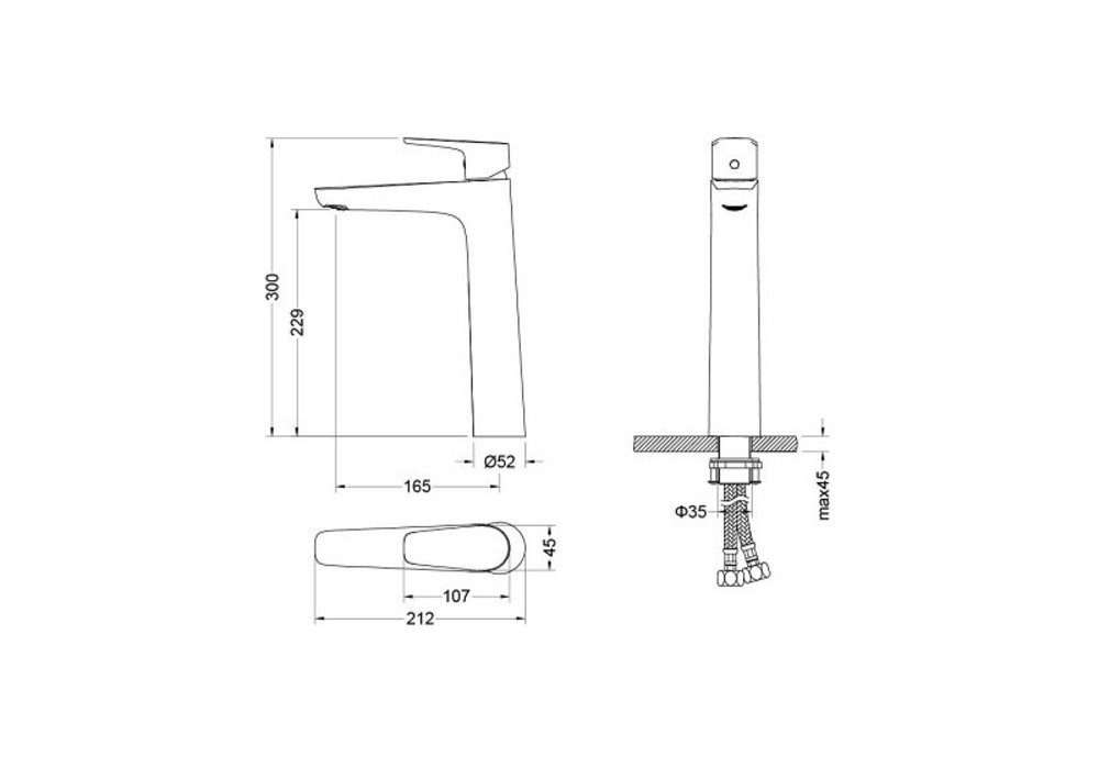 Комплектация: смеситель, гибкая подводка 60см, монтажный комплект.