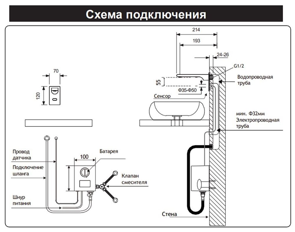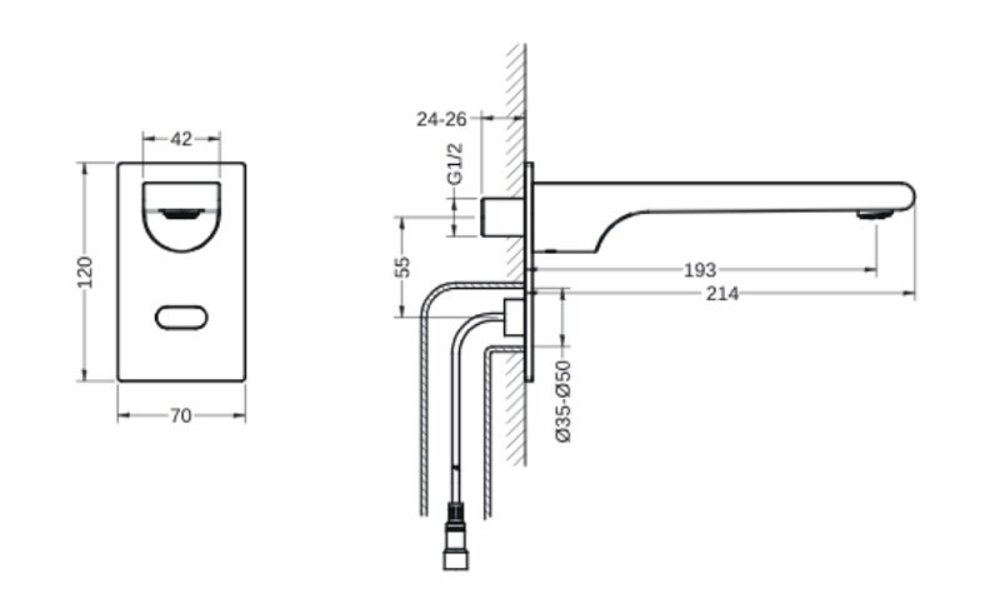 Электронный смеситель оснащен инфракрасным датчиком для активации электромагнитного клапана.Удобство - вода начинает течь автоматически, когда руки находятся в зоне действия датчика. Когда руки убираются из зоны действия датчика, вода прекращает течь, с максимальной продолжительностью потока 60 секунд. Исключительный эффект экономии воды - позволяет максимально экономить воду, поскольку вода течет только тогда, когда пользователь подносит руки к смесителю с низким расходом воды – 8,5 л/мин.Зона чувствительности датчика 5 -30 см. Источник питания - щелочные батарейки 4×1,5 В AA и/или электропитание от сети 220 В 50 Гц.Срок службы батареи около 109500 циклов (1,5 года при 200 использованиях в день). При подключении к электросети питание идет от сети 220В, в случае отключения электропитания или сбоя, смеситель автоматически переключается на питание от щелочных батареек.Смеситель также может эксплуатироваться с подключением только к электросети или с питанием только от батареек.Батарейки в комплект не входят.Стандарт подводки - G(½)''