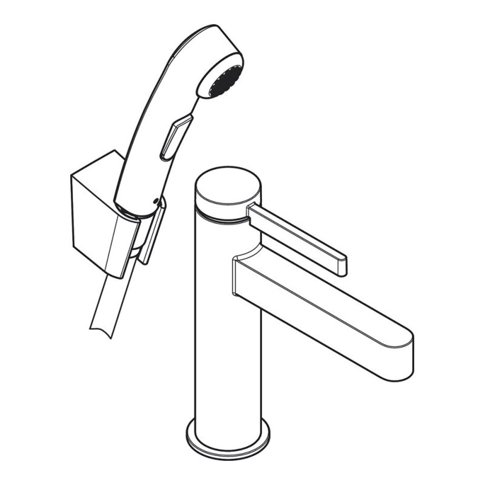 Состоит из: однорычажный смеситель для раковины, ручной душ бидетте, держатель для душа, шланг для душа, слив/перелив
