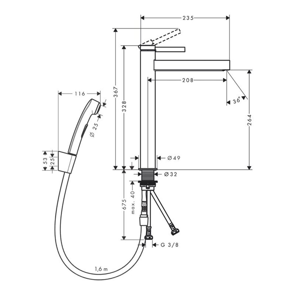 Состоит из: однорычажный смеситель для раковины, ручной душ бидетте, держатель для душа, шланг для душа, слив/перелив.