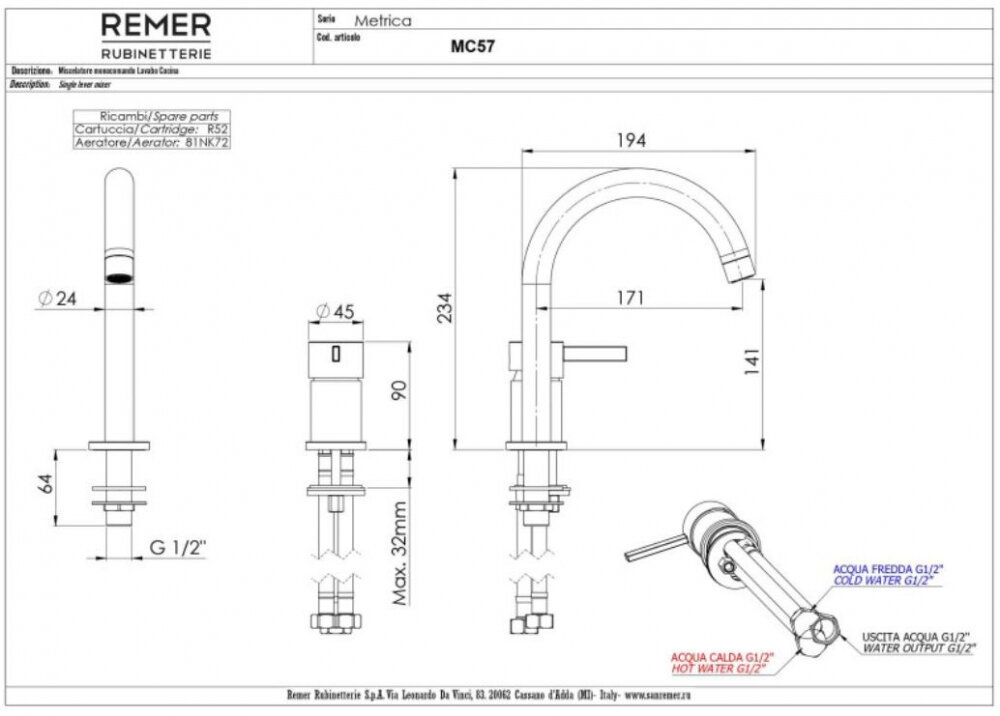 Смеситель для раковины и умывальника Remer RR MC57 Серия Metrica. Дизайн этой серии разработан Кристианом Мапелли (Cristian Mapelli) и отделом научных разработок и развития компании Remer. Прекрасно подойдет для модернизации или ремонта практически любого помещения. В Серии Metrica используются картриджи, выпускаемые STSR-технической лабораторией научно-исследовательских и конструкторских разработок. Корпус смесителя полностью изготовлен из латуни. Гарантия 5 лет. Сделано в Италии.